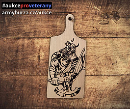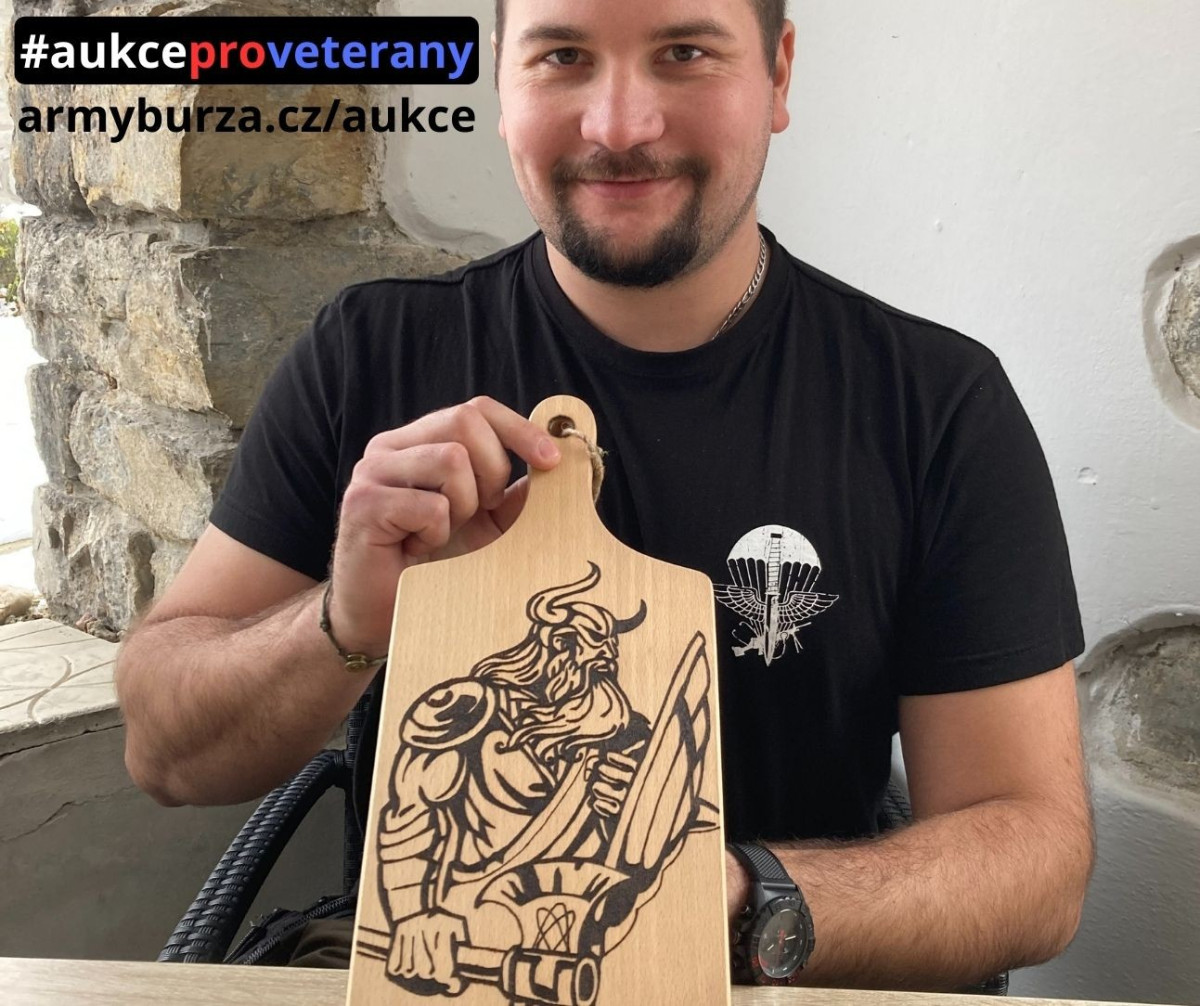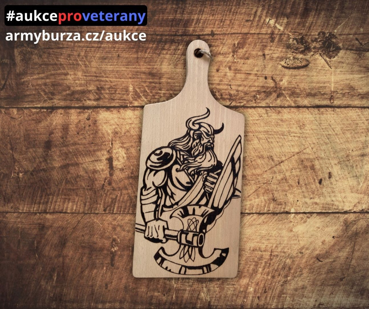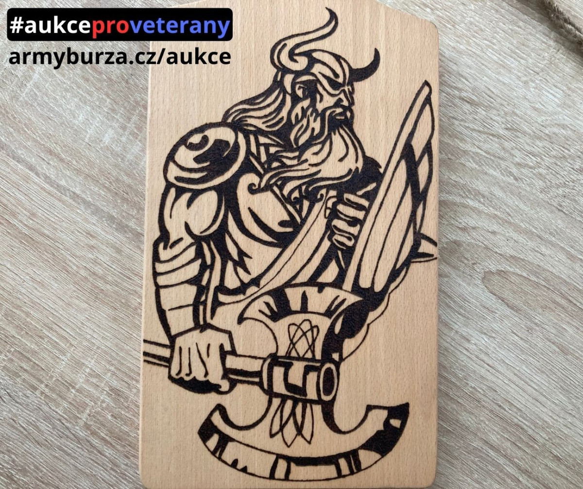 V rámci 2. kola #aukceproveterany můžete dražit mimo jiné prkénko s ručně vypalovaným motivem vikingského bojovníka, které zhotovil a věnoval četař Libor F. Umění pyrografie se naučil od svého otce.