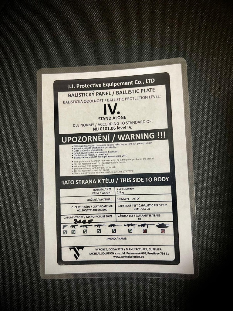 Zdravím, prodám 2 kusy plátů od tacticalsolution.eu v odolnosti IV. dle NIJ 0101.06. Rozměry 250x300x25 mm. Bližší informace na štítku (viz foto). Kupované letos v lednu na nocompromishouse. Nebyly ani jednou venku. Ideálně osobní předání v Praze. Prodávám protože je nakonec nevyužiji. Původní cena: 8900,-/ks. Prodám za 7000,-/ks.