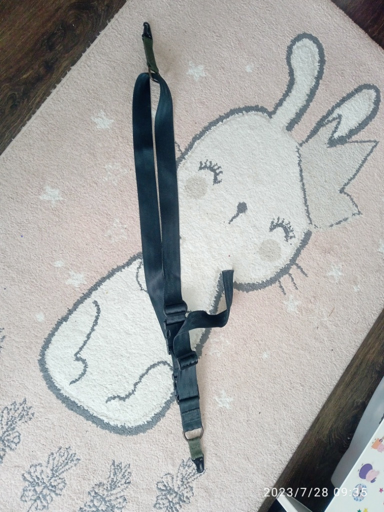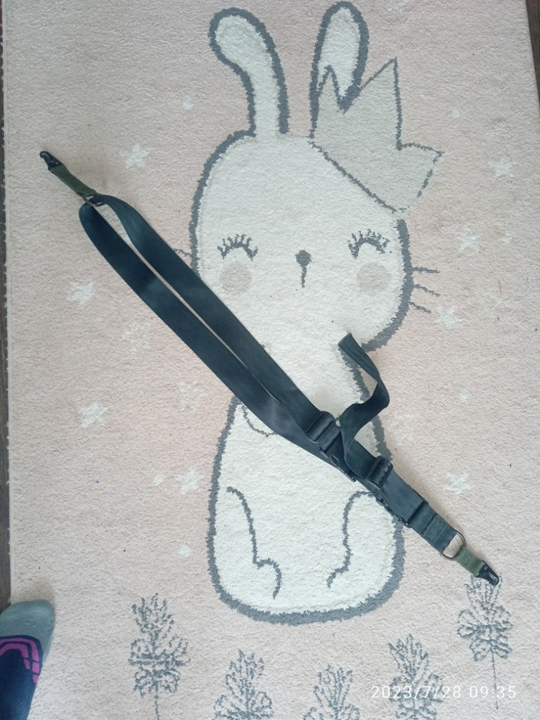 Home made široký popruh roznese lépe váhu na rameno, kovové spony na kterých se Vám nic jen tak neutrhne, masivní plastové spony pro nastavení délky popruhu. Foto pro představu :-)