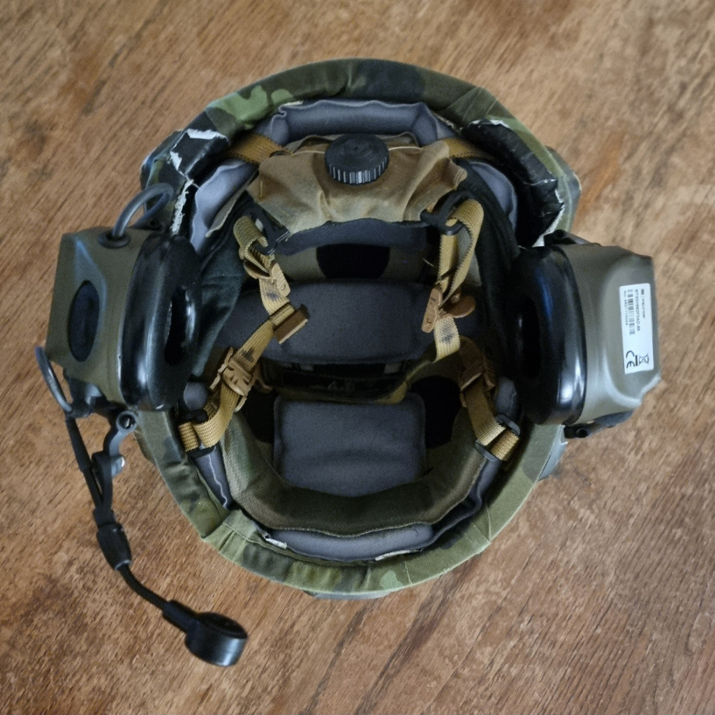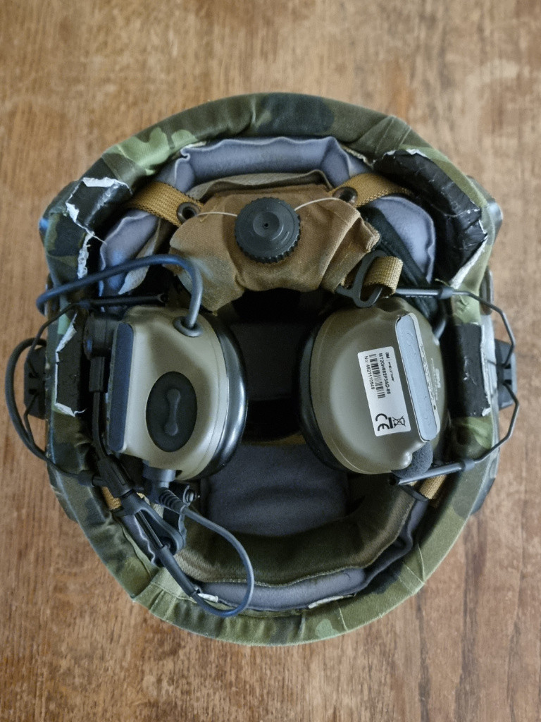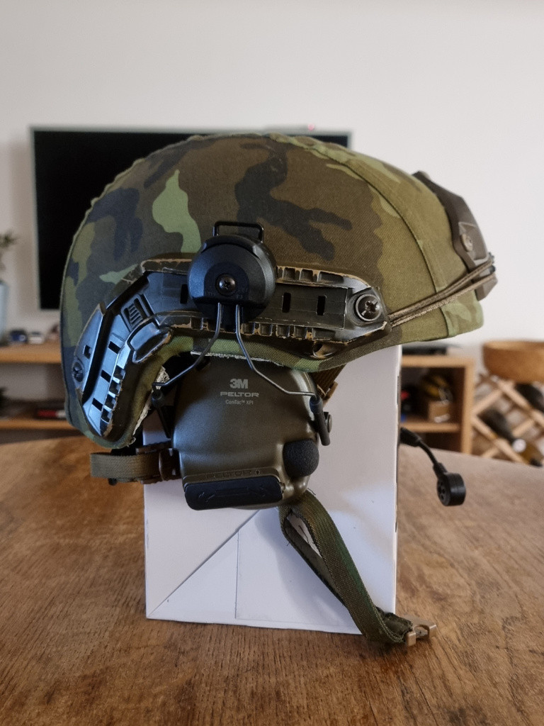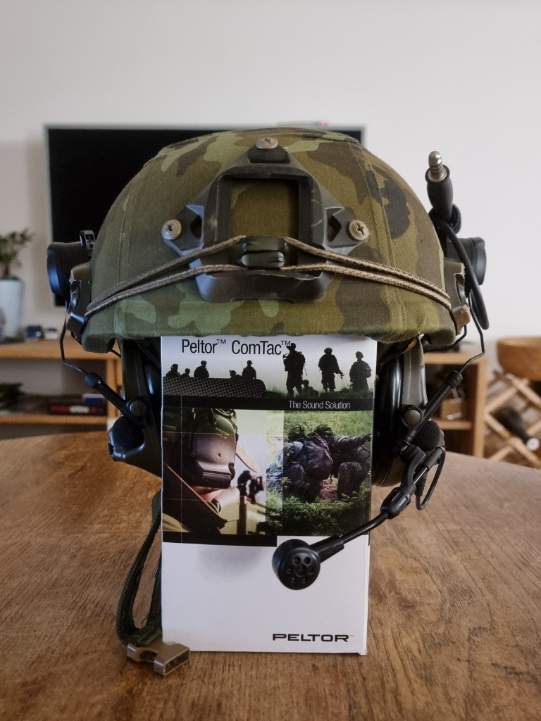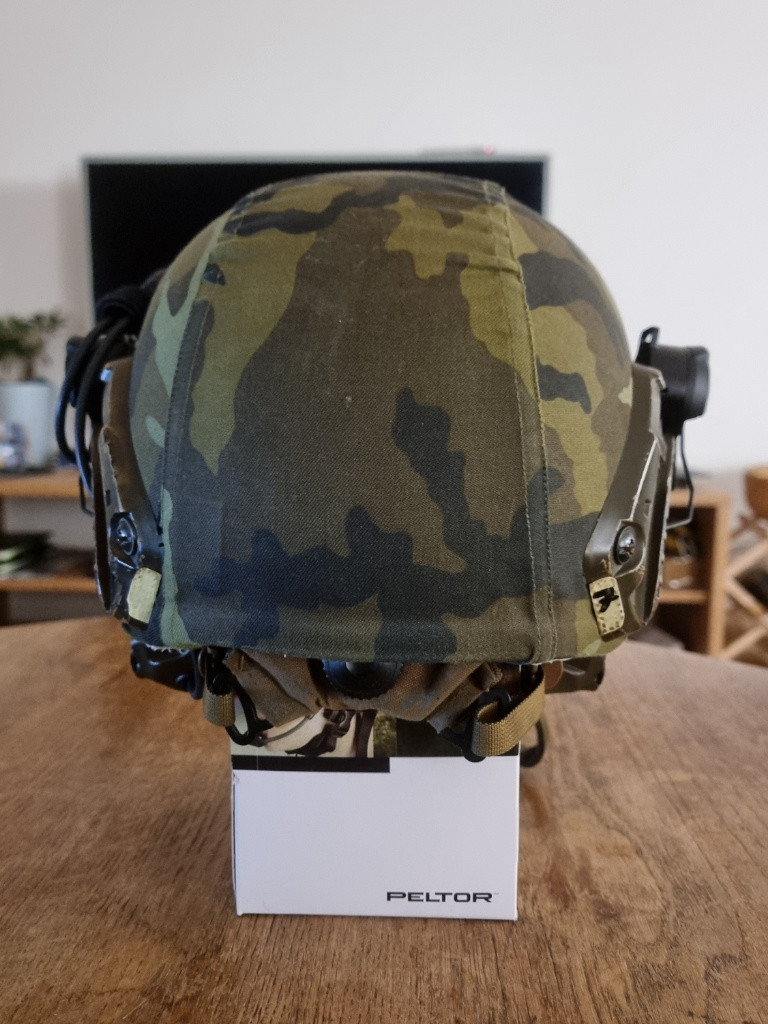 Zdravim, prodám prakticky nový Peltor headset ComTac XPI/V od 3M, je na adaptérech na ARC raily na balistické přilbě "FAST" od UaRms, helma je cca 7 let stará, bez poškození ale bohužel už i bez štítku, s vz.95 potahem, polstrování a řemení ala Team Wendy Epic (je trochu zelené od makeupu), k tomu set silnějších polštářků a maskovací přehoz