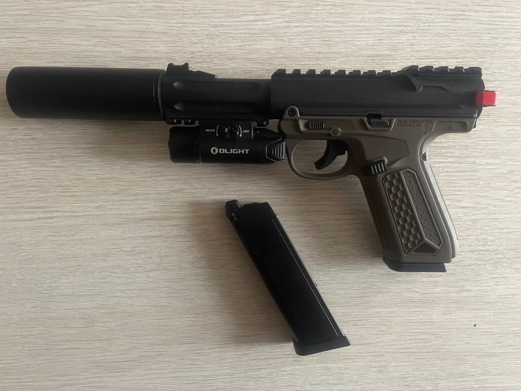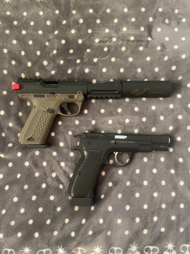 Prodám Aap v lehkém upu:hlaveň Prometheus 208mm,guma mapleleaf,upgrade spoustaku,cnc natahovací páka,tlumic a 2 kovové zasobniky.cena 2750,-///dale cz 75 para se dvěma zasobniky(gg a co2) a holsterem cena 2750,- Pri koupi obou cena 5000,-