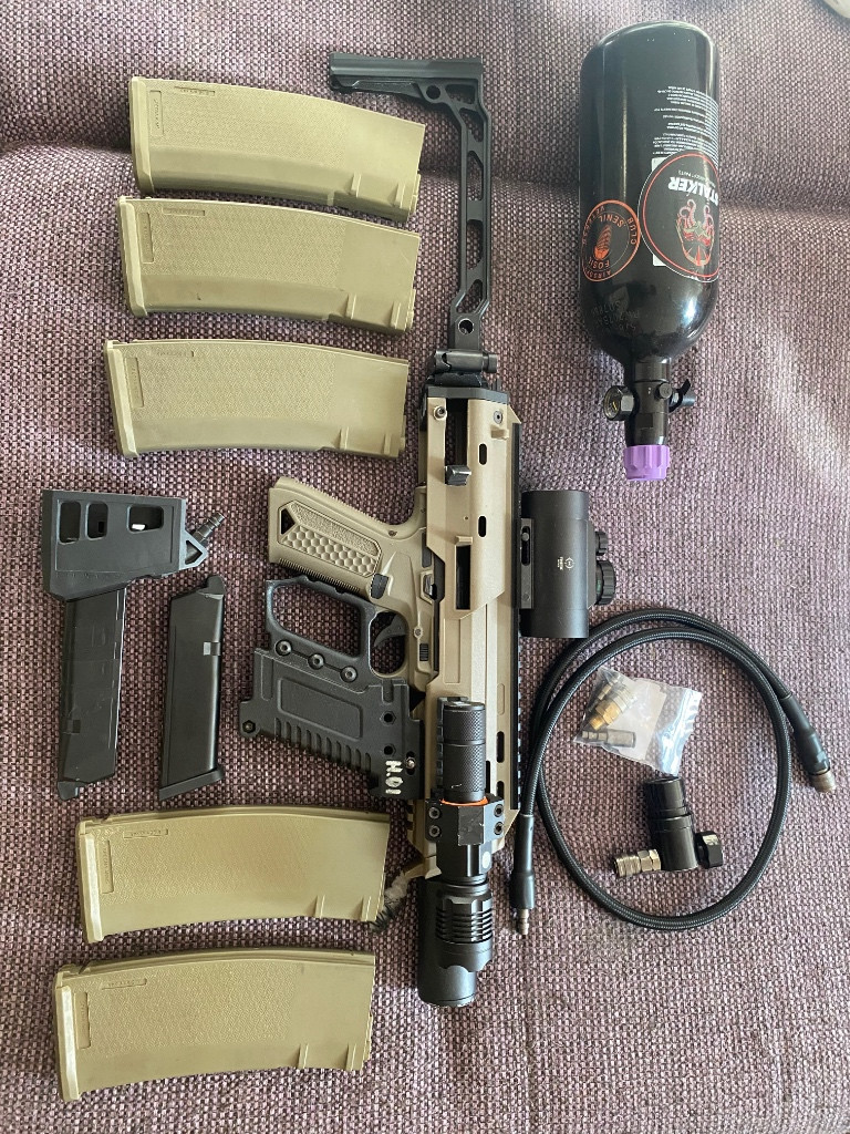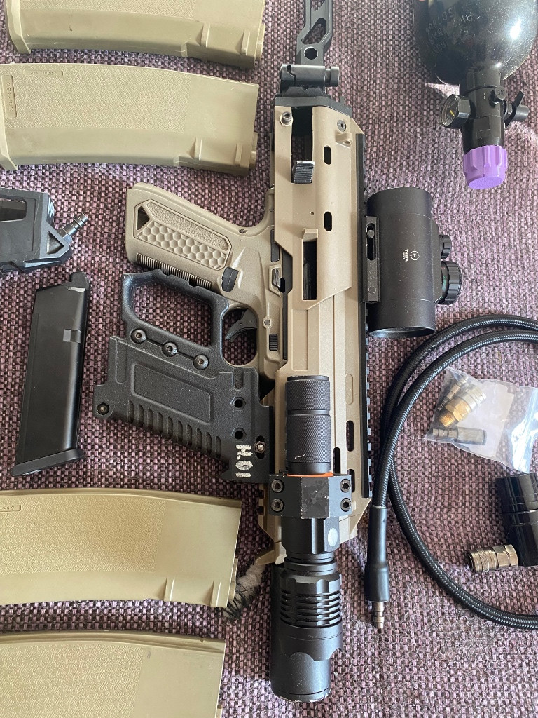 Prodám AAP komplet přestavěné na HPA, Kladívko, pin lock, hop komora, hlaveň, pružinky. Kit aap vzhled MP7 lepší kovová pažba, tlumič, kolimator, svítilna na USB. Redukce zásobníku M4 5x zásobník M4 1x zásobník aap Láhev vzduchu 0,8l , Regulátor s hadicím balystick. Ideální osobní odběr