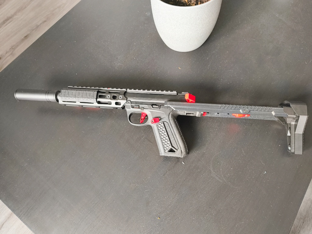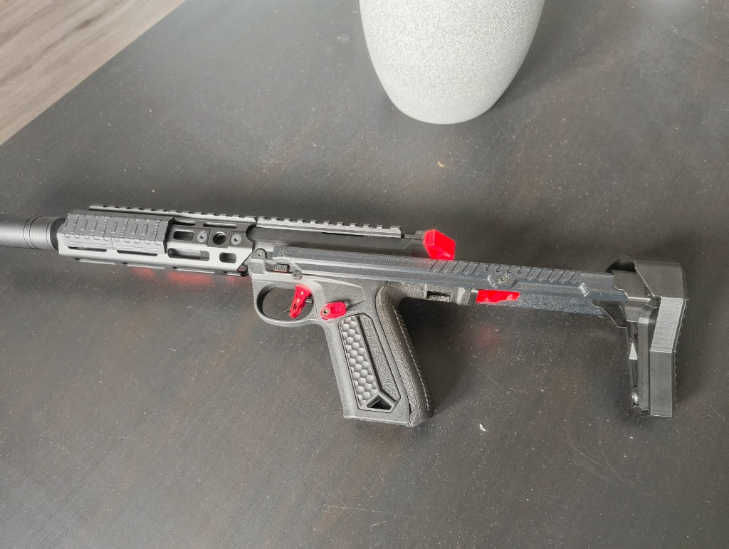 Prodám svoje AAP, redukuju sbírku, protože mít zbraní víc než kolikrát jdu ročně na akci není zrovna praktický. Na prodej je zbraň tak jak je na fotkách, plus 2x 50ran WE zásobníky (samostatně prodám pokud pouze se prodá samostatně zbraň) a většina původních dílů. Co se týče vnitřního upgradu tak jsem měnil hlaveň za 200mm 6.01mm nerez, hopgumu za ML autobot, komora je 3D tisk TDC, v trysce měněná rocket valve pružina tuším CowCow (klapka je základní) aby bylo dost plynu pro delší hlaveň, vratná pružina + recoil pružina od Waldo Customs (standart stroke), stavitelná TTI spoušť, zesílený záchyt zásobníku protože základní moc neudrží 50 ranný zásobníky. 3D tisk kit s teleskopickou pažbou je tisknutý z PETG s příměsí carbon vláken/ASA. Kit umožňuje rozborku bez nástrojů a rozebírání, přístup k přepínači střelby. Na green gasu mi to dávalo nějakých 1.7J s 0.32g. Odběr osobně Plzeň nebo pošlu na dobírku při zaplacení poštovného předem. Na vyžádání není problém poslat víc fotek. V případě zájmu není problém vytisknout jakýkoliv foregrip nebo i celý kit.