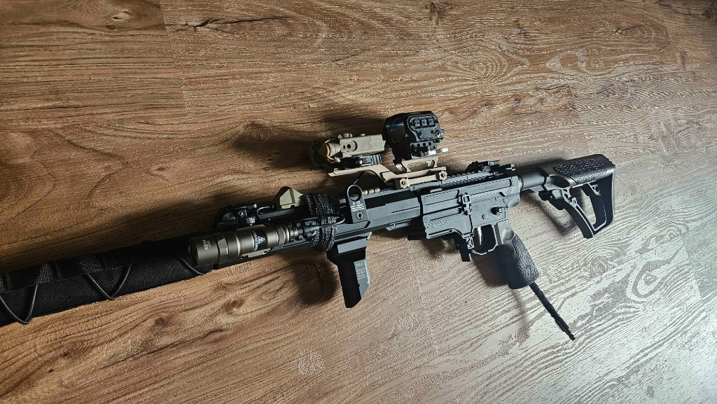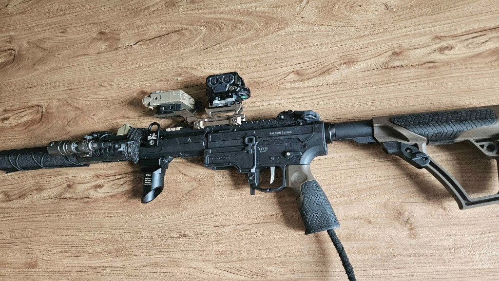 Prodám nebo vyměním tuhle neobvyklou krásku za něco zajímavého. Uvnitř pulsar D s upravenou pružinkou. Uvnitř 301mm 6.04 přesná hlaveň, 70 ML gumička. Na zbrani hydra, steiner, dvojitý spínač, DD grip a pažba, Zenitco doplňky, funkční tlumič, takže zbraň je hezky tichá. Dává 1.7j na 0.28 při 70psi. 35rps momentálně nastaveno. Více info rád hodím do mailu ;) PS AAP nechci, pokud neni ze zlata :)