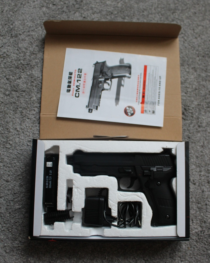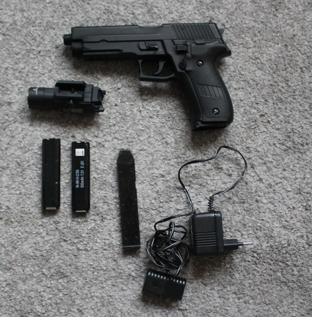 Prodám elektrickou pistoli Sig Sauer P.228 AEP CM122. Je to verze bez mosfetu. Je to tomu jeden zásobník, nabíječka, originální krabice návod, 2 x baterka - jedna starší a jedna nová. svítilna na ris lištu. Platí do smazání.