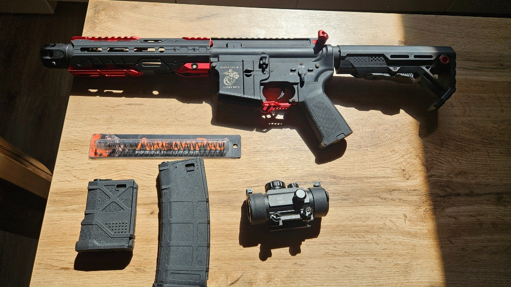 Prodám věci na airsoft bohužel na to nemám čas a jen mi to doma leží, vše je funkční a v dobrém stavu Zbraň ma lehounké oděrky ale nic fatálního zbraň je v základu , jediné co bylo vyměněné je pažba z důvodu malého úložného prostoru pro baterku Zásobník 70 ran tlačny - 100 Kč Zásobník 120 ran tlačný - 130 Kč Zbraň M4 - 2800 Kč Baterka - 280 Kč Nabíječka - 300 Kč Ubečko - 300 Kč Kolimátor - 500 Kč (Bez baterek) Nutno dokoupit cca 40-80 Kč v obchodech Klobouk - 150 Kč Přenosné pouzdro - 400 Kč Vesta - 400 Kč https://airsoftpro.cz/cz/zasobniky-plnicky/pro-elektricke- zbrane-aeg/zasobniky-pro-m4-m16/polymerovy-zasobnik- enforcer-hpa-speed-pro-m4-na-70-ran-tlacny-cerny-detail https://airsoftpro.cz/cz/outdoor/obleceni/klobouky/klobouk- bonnie-hat-aor2-detail https://airsoftpro.cz/cz/akumulatory-nabijecky/akumulatory- nimh/akumulator-9-6v-1600mah-mini-cqb-2-detail https://airsoftpro.cz/cz/akumulatory- nabijecky/nabijecky/nabijecky-pro-nimh/inteligentni-nabijec- nimh-baterii-mh-8s-detail https://airsoftpro.cz/cz/airsoftove-zbrane/elektricke-dlouhe- aeg/m4-m16-sr25-416/airsoftova-zbran-ec-337-m-lok-cervena- detail https://airsoftpro.cz/cz/vystroj-uniformy-pouzdra/pouzdra-na- zbrane/prepravni-pouzdra/pouzdra-pro-dlouhe-zbrane/textilni- pouzdra/dvojite-prepravni-pouzdro-zbrani-60-a-100cm-cerne- detail