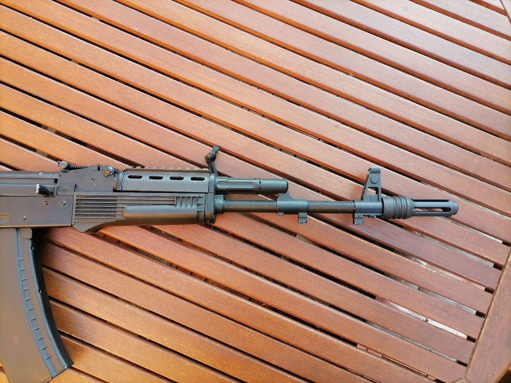 Predám airsoftovu repliku AK74 od výrobcu CYMA Mechabox repliky je v základe Jediné čo bolo menené je nasledovné: -elektronika -vonkajšie diely ako kompenzátor AK200, pištolová rúčka AK12, modifikovaný obťahovací mechanizmus, nadpažbie s ris lištou a patka pažby Umiestnenie batérie sa nachádza v pažbe, priestor pažby umožňuje schovať batériu vo veľkosti 9.6v 1600mAh - tvar batérie kváder. Energia repliky, s 0.25g bb 1.3J Kontakt prosím cez email, v prípade záujmu píšte a skontrolujte si spam v prípade odpovede. Cena 95€