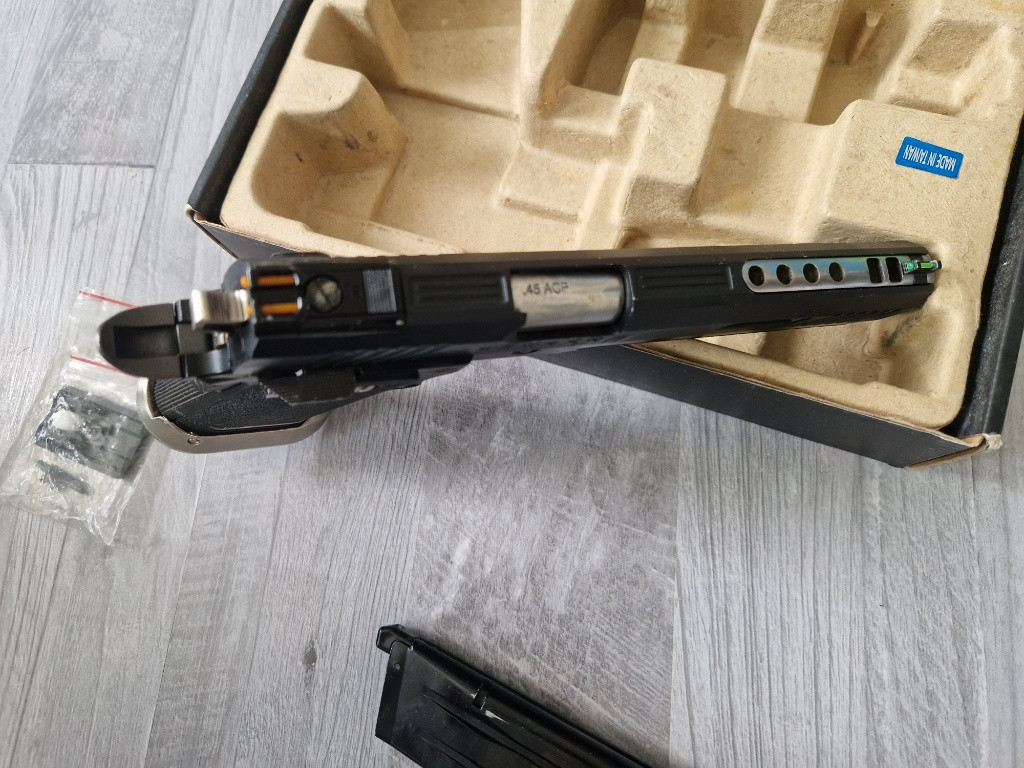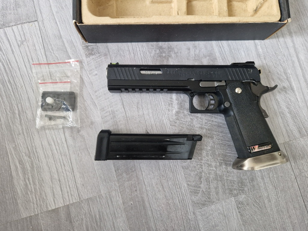 Prodám plně funkční airsoft pistol hi-capa irex od značky WE. Zásobník těsní, zbraň je nově promazaná. Přidám originální krabici a adaptér na holografická mířidla.
