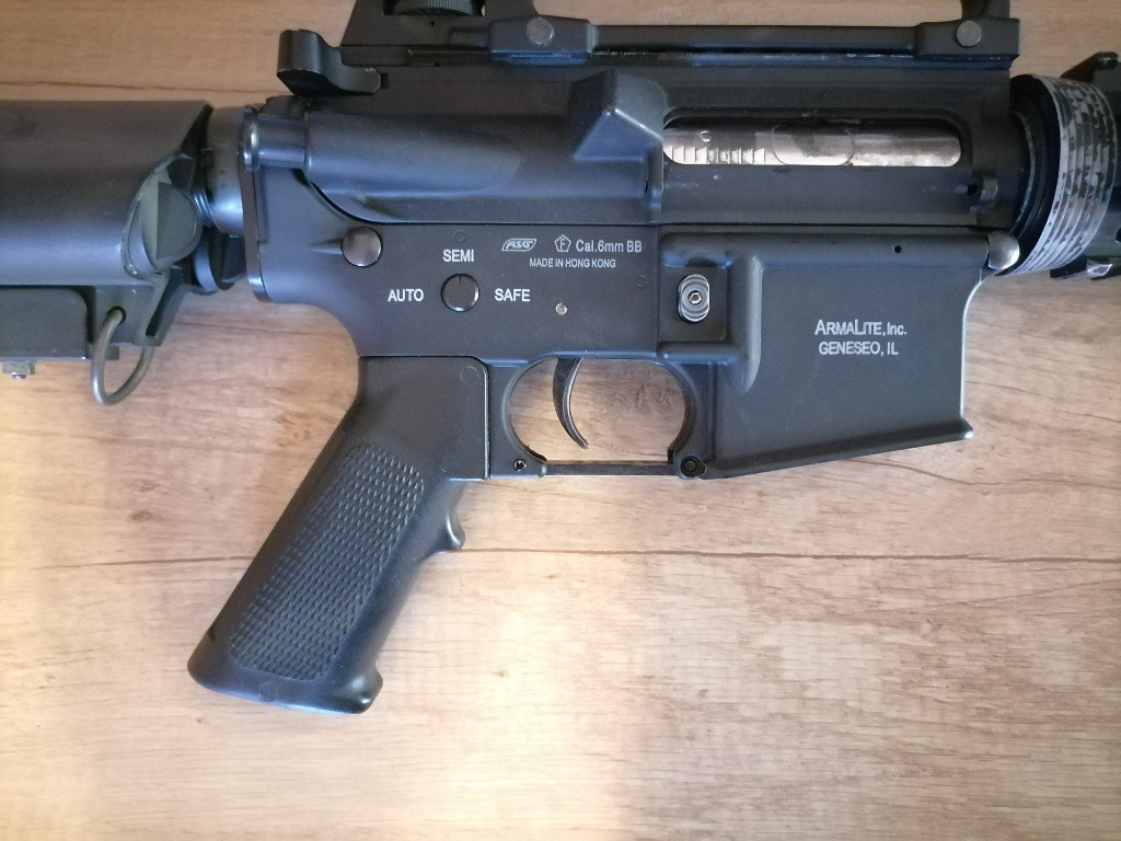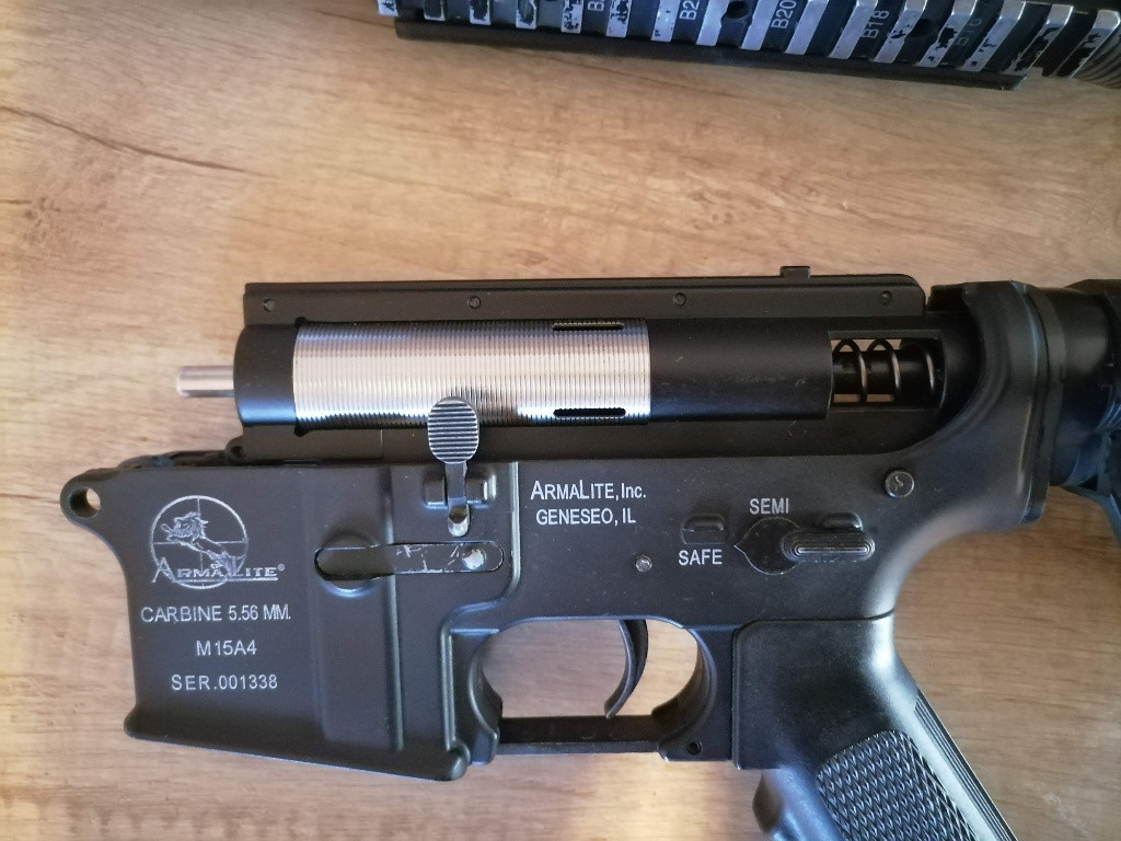 Predám airsoftovú repliku M15A4 od výrobcu ArmaLite - ASG. Vonkajšie diely sú pôvodné od výrobcu ArmaLite ale vnútorné diely sú už menené. Nový mechabox od výrobcu Delta Armory s možnosťou rýchlej výmeny pružiny, motorček od Delta Armory, hop up komora od Delta Armory. UPGRADE: DA piest s kovovým ozubením a mosadznou hlavou piestu s jedným O-krúžkom, hlava valca DA, valec DA s dierami na zodpovedajúcu dĺžku hlavne, pružina DA M110, tryska od výrobcu AS parts dĺžky 21,2mm, vnútorná hlaveň maple leaf o dĺžke 370mm a priemeru 6,03mm, maple leaf 60° žltá MR hop gumička. S guličkami 0,25g namerané 1,69-1,71 J, 381,5 FPS / 116 ms. Ku zbrani sú 2x točný zásobník, 2x low cap 20bb vietnam prevedenie, 3x tlačný zásobník o kapacite do 90bb. Umiestnenie batérie je v pažbe. Replika bola hrávaná s pôvodným mechaboxom, ale časom proste mechabox pukol, výmena za Delta Armory. S takto upravenou replikou som len robil na strelnici nástrel a meranie, odohraná len jedna hra, odvtedy odložená, čo činí aj dôvod predaju - nemá žiaľ využitie. CENA: 125 eur