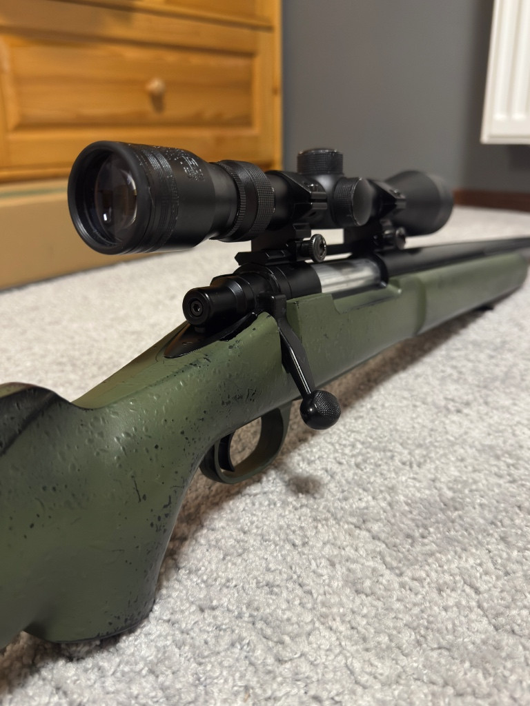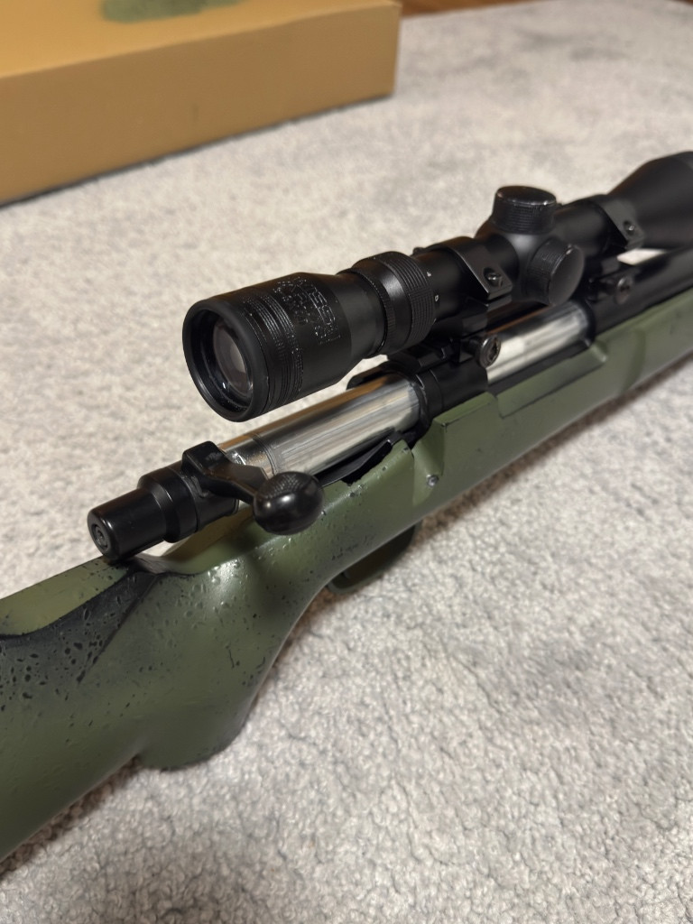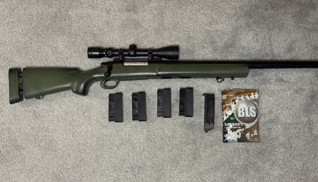 Prodám airsoftovou odstřelovací pušku M24 Military version CM.702A značky CYMA, původní barva černá - nabarveno nazeleno. Pušku jsem použil na 4 akcích, jinak byla používána doma k rekreační střelbě (vystříleno cca 250 kuliček). Zbraň jsem řádně vyčistil a namazal. Na vnějšku zbrani jsou malé stopy zaschlého lepidla po předchozím maskování. Mohu přidat maskovací trásně a Woodland maskovací pásku. Pažba je nastavitelná. Obsah balení: odstřelovací puška, 4x zásobník, puškohled značky Swiss ARMS s ochrannou clonou proti slunci, kuličky BLS 0.40 g, 75 % balení, plnička, náhradní redukce na tlumič, zelená armádní barva ve spreji a další náhradní díly. Chtělo by to trochu poradit hop-up. Jediné co chybí, je pojistka spouště. Původní cena s puškohledem: 3 700 Kč Možnost osobního převzetí nebo zaslání na adresu. V případě zájmu a více info prosím SMS/e-mail.