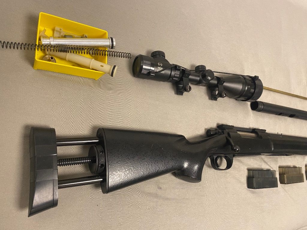 Zdravím, posílám do světa svoji m24. Důvod prodeje - snipy nejsou pro mě. Komora aspro gen3, diy tdc - nastavení šroubek (klasický z merkuru), gumka guarder průhledná, přítlak - omega nub aa, hlaveň action army 6,03, vnější hlaveň dodatečně zafixovaná k tělu (takže nemá žádný vakl oproti základu), pps vzduchotechnika (komplet přetěsněno), pažba vycpaná molitanem, v gripu diy slot na imbus. K pušce přidám zbytek základních dílů, aspro trn a píst, náhradní vnějši hlaveň, adaptér na tlumič, optiku theta s podsvicenim (3-9x), 2x funkční zásobník. Preferuji osobní předání Praha (stromovka, přes týden), nebo Hradec Králové (Malšovice, víkendy).