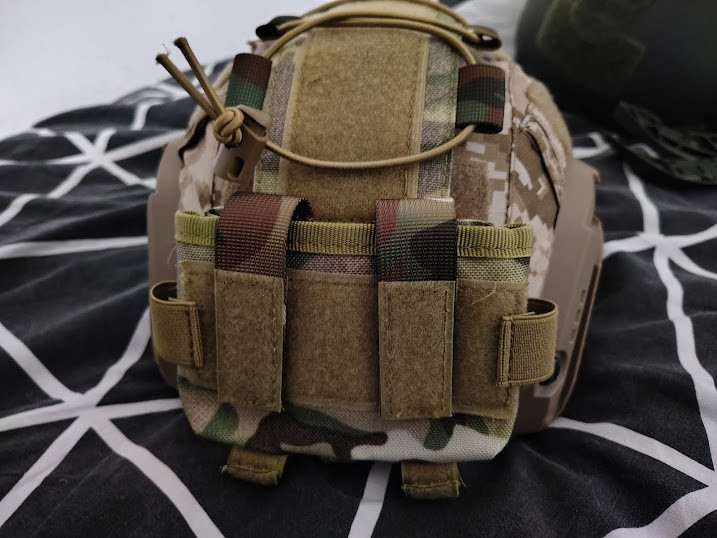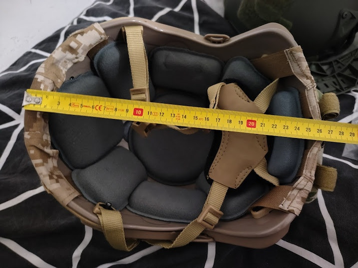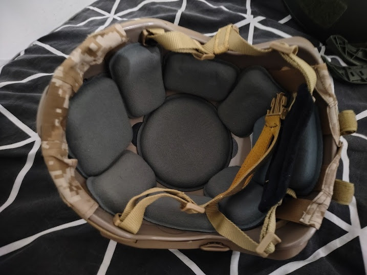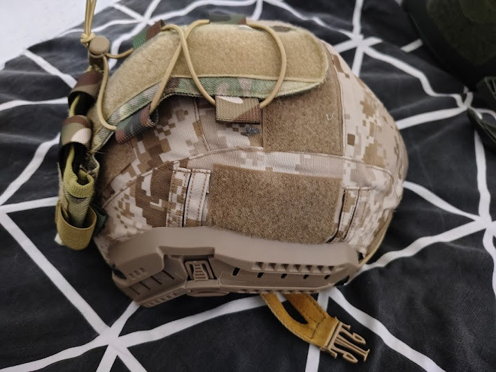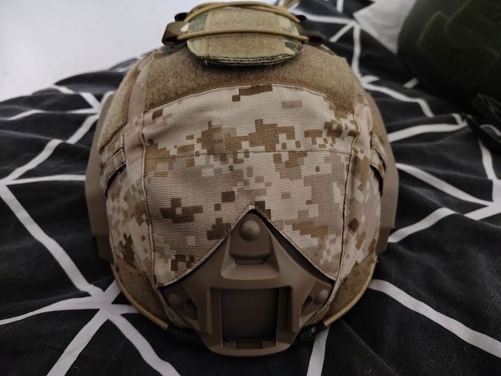 Nabízím airsoftovou repliku taktické helmy od firmy FMA v pískové barvě. Nebyla nikdy na žádné akci. Potah značky Invader Gear v maskování digital desert. Noname kapsa na baterii v multicamu. Pořizovací cena cca 900,-