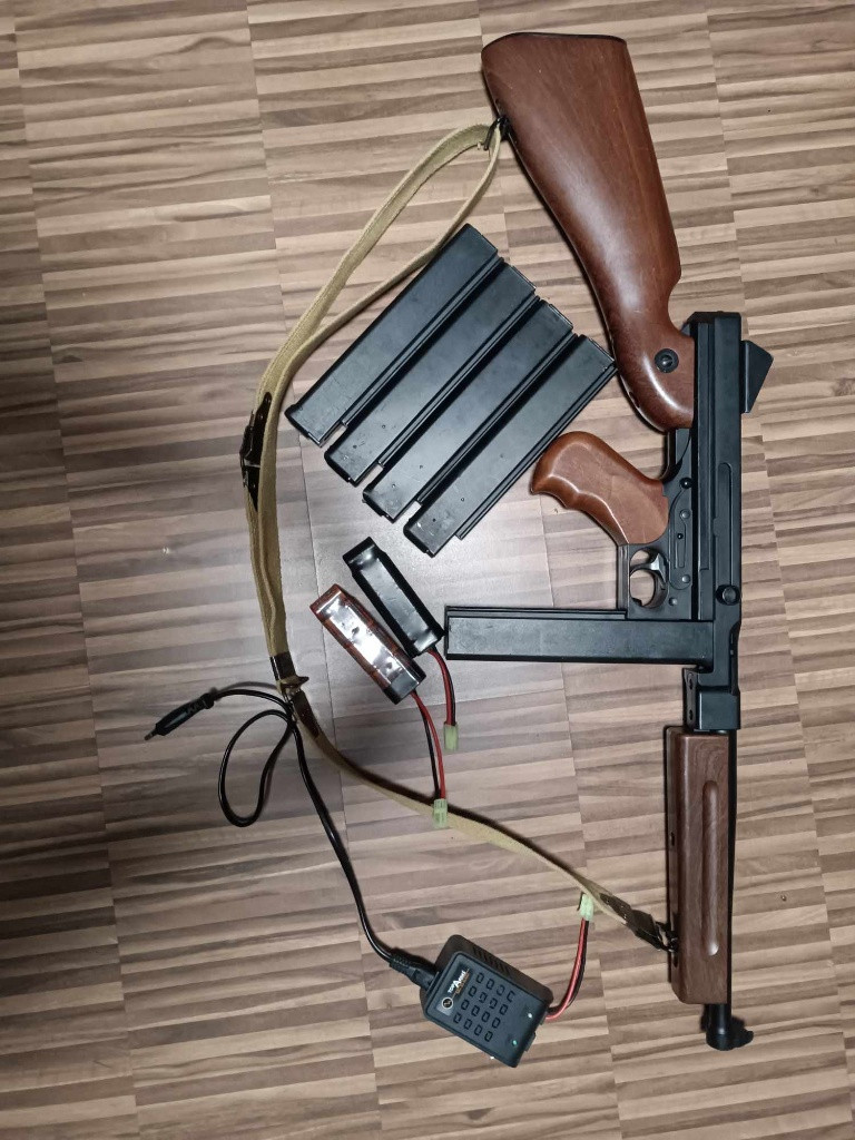 thompson od výrobce cyma, kov/plast v ceně: samopal 2x tlačný zásobník 240 ran 3x točný zásobník 420 ran 2x baterie 7,4 V WW2 popruh s mosazným kováním