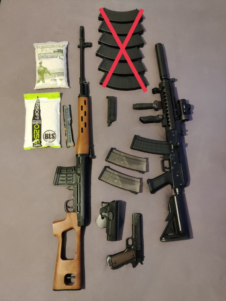 Prodám celou svoji airsoft výbavu – již nevyužiji, není čas. Prodám jako celek nebo po částech dle domluvy. Airsoftová pistole 1911 – celek za 2000 Kč + originální krabice • Airsoftová pistole 1911 A1 - celokov, blowback – CO2 bombičky • 12g plynová bombička s CO2 + 1x 12g CO2 plynová bombička se silikonovým olejem • Pouzdro pro pistole 1911 – Black (AMOMAX) AK-105 – celek za 4000 Kč + originální krabice • AK-105 RAS Tactical, ocel, Black, Cyma Standard, CM.040I • Tlumič • Tubusový kolimátor • Vysokokapacitní zásobník stylu AK74 Bulharsko na 450 ran - 2ks • Tlačný zásobník PMAG pro AK na 200 ran - 6 ks • Ruční rychlo-dobíječka (plnička) zásobníků na 90-100 kuliček SVD Dragunov – celek za 2200 Kč • Manuální SVD Dragunov • uvnitř Pružina s progresivním vinutím pro AEG - M160 • k tomu pružina M200 další: • Airsoftové kuličky BLS Precision Grade 0,25g | 4000 ks | 1 kg - bílé - nové – 200 Kč • Airsoftové kuličky bílé 0,25g – 4000ks - 150 Kč • Inteligentní nabíječ GFC Smart pro NiMH, Li-Pol, Li-Fe, Li- Ion a NiCd – 900 Kč • Nabíjecí adaptér 8.4V DC 300mA 100 Kč • Akumulátor NiMH 8,4V / 1600mAh – 100 Kč • Airsoft Gens Ace LiPo – 3S 1200mAh 11,1V 3S1P (25C), Mini Tamiya Plug - 300 Kč • maska obličeje Shadow Warrior s kuklou - Olive Drab - 200 Kč • textilní pouzdro na dlouhou zbraň vz.95 – 300 Kč • taktická helma černá – 200 Kč • 2x ochranná maska obličeje s mřížkou – 1 ks za 100 Kč • stehenní sumka na 2 zásobníky (olive) – 150 Kč • stehenní pouzdro na krátké zbraně (olive) – 150 Kč • opaskové pouzdro na krátké zbraně (olive) – 100 Kč • AČR kukla (olive) 3 otvory - domluvou • čiré brýle 2x - domluvou Používáno cca na 10 akcí.