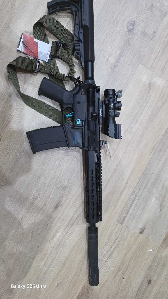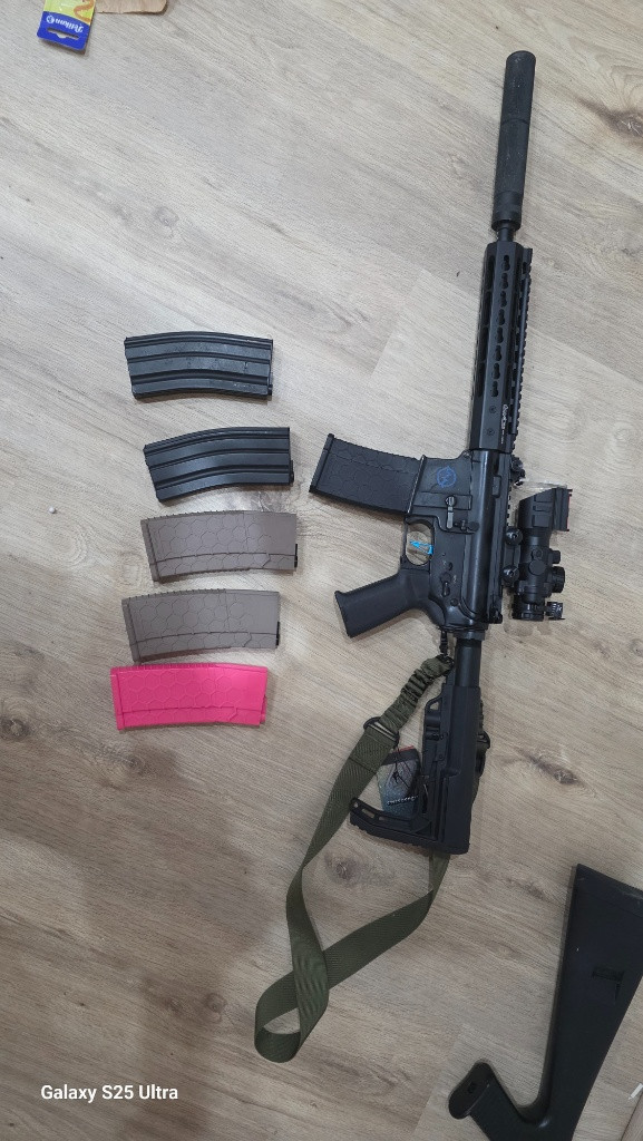 M4 kompletní upgrade dává 135ms na 0,20bb zbraň má v sobě zátěžová kola + motor shs ,novou vzduchotechniku pist shs celokovove ozubení ,mosfet, nová 8mm kuličková ložiska , prowin komora , hlaveň 6,02, nové předpažbí přidám 4x tlačný zasobnik na 140bb a 2x točný ,2x baterku 11,1v ,kule a optiku 3x