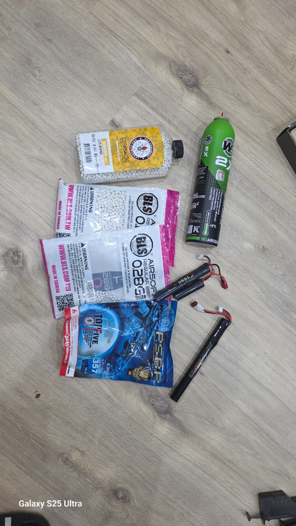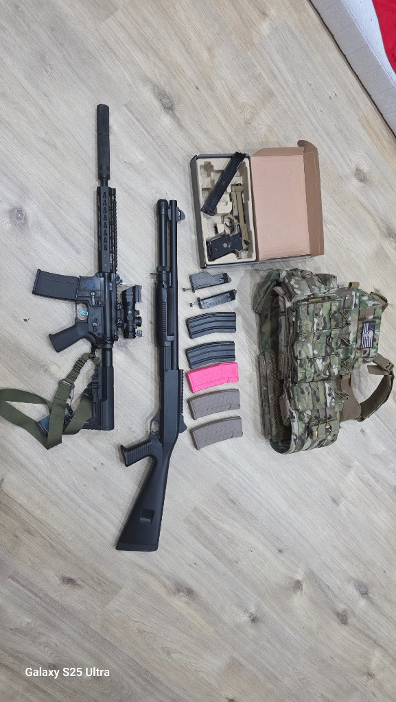 Prodam vše co je na foto m4 tělo toparms + 4x tlačák na 140bb + 2x točak +2x baterie 11.1 m4 dává 135ms s 0,20bb je tam hlaveň 6,02 ,zátěžová kola shs + motor shs ,pist shs celokovovím ozubením + komplet vzducharna tryska s 2 kroužkama ,8mm kuličková ložiska, komora prowin, mosfet ,nové předpažbí + optika 3x zoom Dále brokovnice střili 3bb najednou 5x patrona značka myslím cyma dále WE m9 2x zasobnik na 25bb a 50bb , vesta warrior asault dcs velikost L nová nepoužitá, přidám plyn a kuličky 0.25 a 0.28 možnost prodat vše zvlášť na ceně se mužem dohodnout