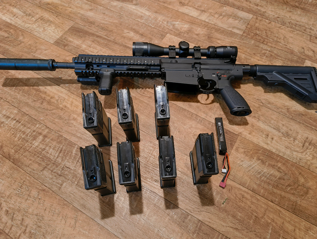 Předmět k prodeji je airsoftová zbraň od E&C HK 417 Výkon 120ms.Stav jako nová,žádné vnitřní úpravy. Optika,7 zásobníku tlačných na 120 ran,baterie 11.1V 1000mah Li pol, tlumič,batterybox.Procesorovka.Celokov takže se pronesete.Preferuji osobní převzetí kvůli pořádnému vyzkoušení.Klidne i dovezu do 150km za poplatek.Mohu přihodit i kule. Nabít a ready do lesa