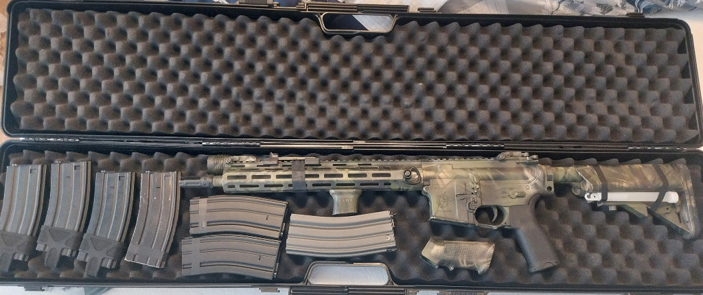 Nabízím k prodeji airsoftovou zbraň G&G TR16 MBR 556WH – Advanced. Zbraň dovezena před několika lety ještě před oficiálním uvedením na český trh. Přestříkána do kamufláže. Vyměněná rukojeť a přidán Foregrip - MFT React. Na předpažbí (M-LOK) je osazena baterka streamlight protac hl-x. Zbraň ve výborném stavu a byla určena spíše pro nácvik, než na airsoft střílení. Výkon viz. foto: na kuličkách 0,2 = 1,54 J na kuličkách 0,3 = 2,31 J. Ke zbrani je jeden originální zásobník + oko na popruh, dále 6x zásobník CYMA (4x tlačný a 2x točný), původní pažbička a kufr.