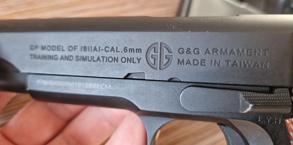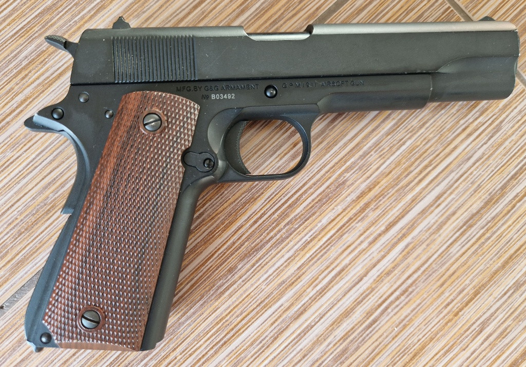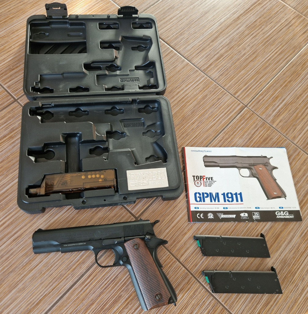 Málo používaná 1911 od G&G + 2 zásobníky Typy airsoft zbraní: Pistole Výrobce: G&G - plynovka s Blowback Režimy střelby: jednotlivé rány Hnací plyn: greenGas Úsťová rychlost (m/s): 100 m/s Úsťová rychlost (fps): 328,08 fps Energie kuličky (J): 1 J Teoretický maximální dostřel (m): 45,15 m Váha zbraně: 1,020 kg Délka zbraně: 220 mm Materiál těla: celokov Závěr: kovový Materiál pažbení: ABS plast Hlaveň: bronzová Délka hlavně: 116,5 mm Hop-up: ano, regulovatelný Zásobník: 25bb, tlačný, kovový Umístění plynové nádržky / CO2 bombičky: v zásobníku Závit pro tlumič: ne Montáže: ne Doporučená váha kuliček: 0,25g - 0,28g