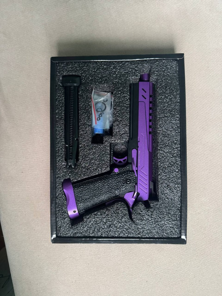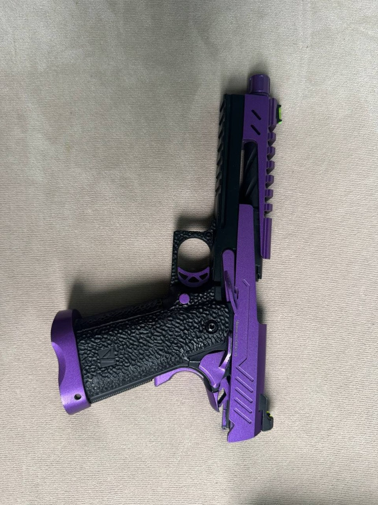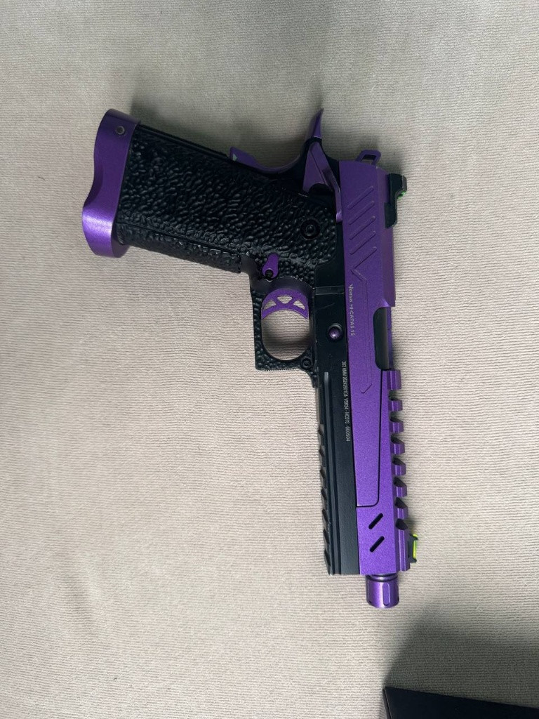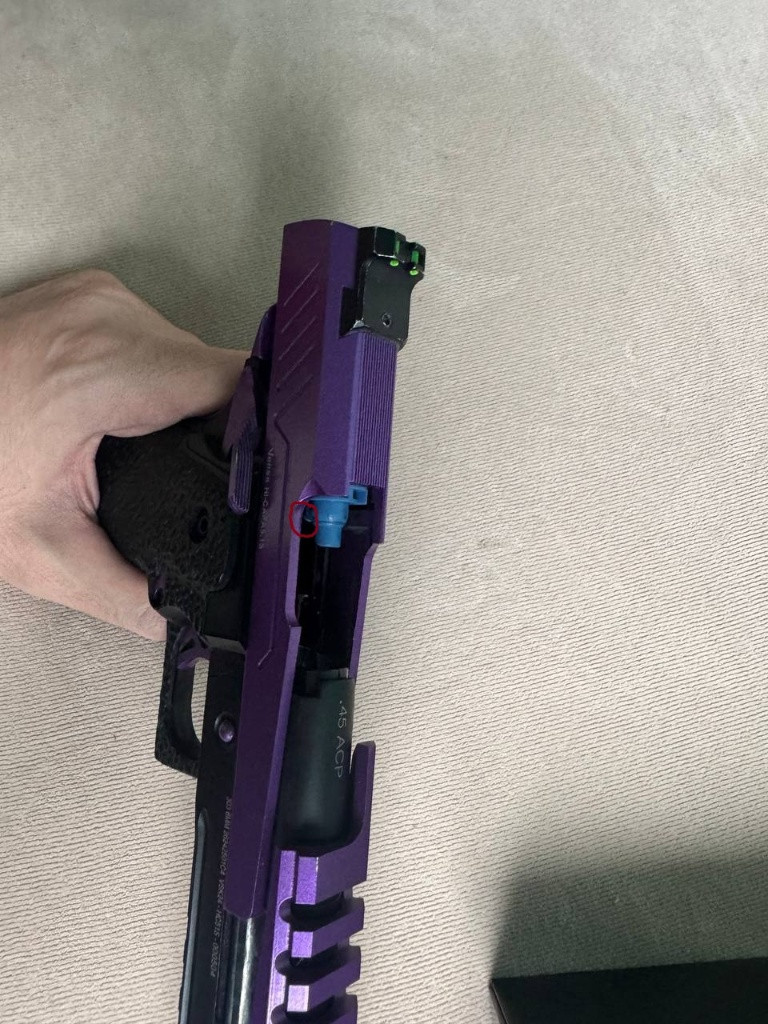 Prodám VORSK Hi-Capa 5.1 Split Slide na díly nebo opravu. V balení je samotná pistole, zásobník, CO2 tryska, nějaká náhradní těsnění, patch a nějaké náhradní drobné díly. Po několika hrách se zničila tryska pro plyn (je vidět na obrázku – nožička, co podává kuličky, se ulomila). Náhradní trysku se mi nikde nepodařilo sehnat. Pro opravu by bylo třeba sehnat novou trysku a hodila by se také vratná pružinka nabíjecí trysky. V balení je CO2 tryska, ale ta s green gasem bohužel nefunguje – v tomto případě by bylo nutné sehnat CO2 zásobníky.