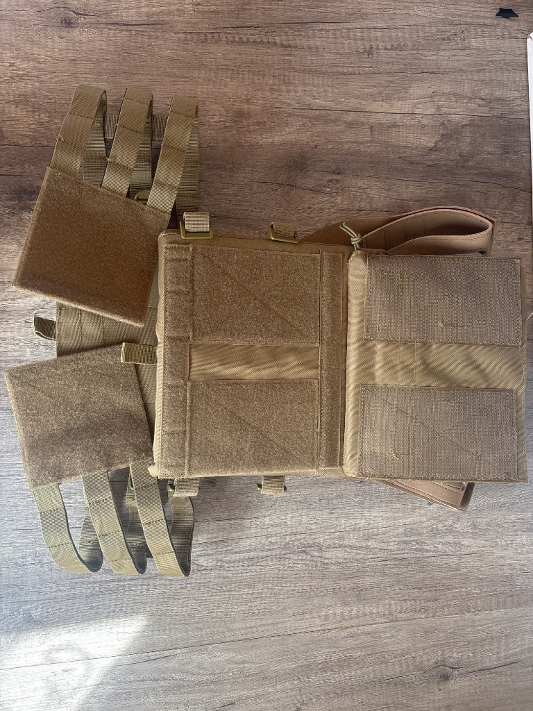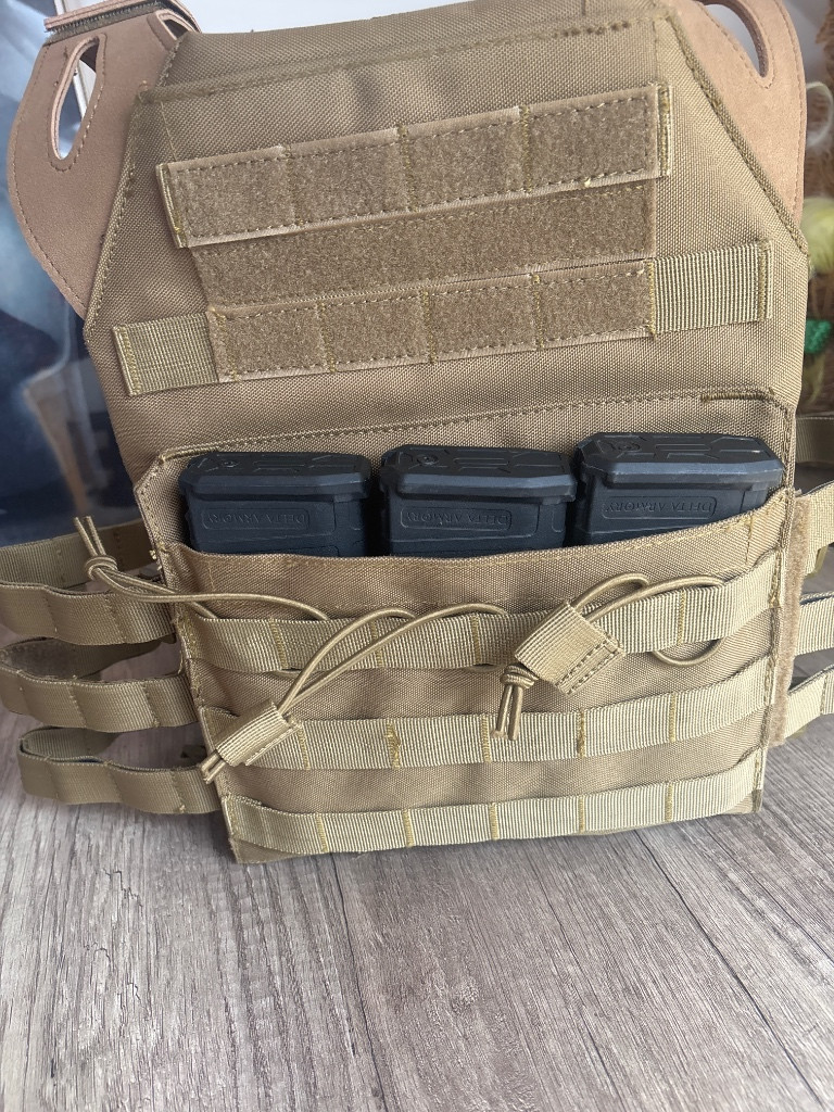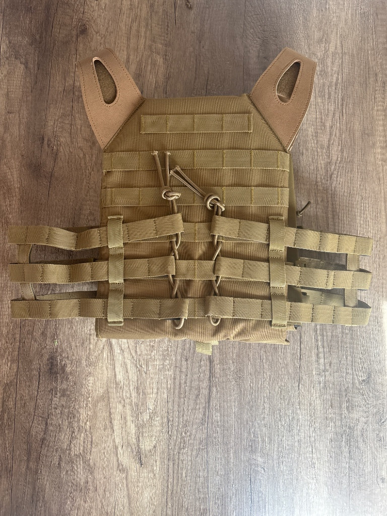 Popis:Airsoftová vesta s imitací plátů a trojitou sumkou M4 Jumper Plate Carrier - Coyote Brown