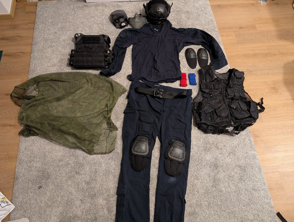Prodám kompletní set taktické výstroje pro airsoft nebo military aktivity. Ideální pro někoho, kdo se chce kompletně vybavit naráz. Sada obsahuje: Oblečení: Taktická blůza a kalhoty (velikost 2XL a 38 kalhoty). Ochrana kloubů: Sada chráničů na kolena a lokty (Knee & Elbow pads). Vesta: Taktická vesta / Nosič plátů s kapsami na zásobníky. Ochrana hlavy: Helma typu FAST/MICH + ochranná maska na obličej. Spojení: Radiostanice Baofeng UV-5R s nabíječkou a handsfree sadou. Stav: Použité, ale velmi zachovalé, čisté и plně funkční.
