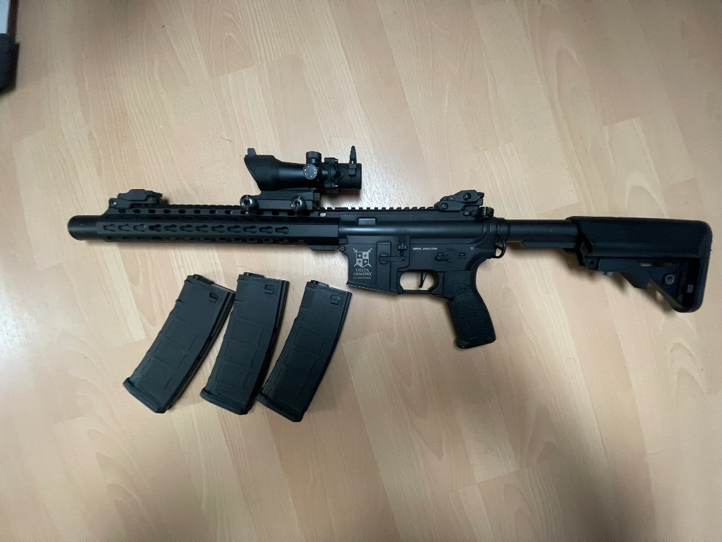 Prodám airsoftovou zbraň Delta Armory s optikou a třemi zásobníky. Zbraň je elektrická a funkční. Zdarma přidám plničku, 4 balení kuliček a obal na zbraň. Nutnost vlastní Lipo baterie. V případě zájmu pište na e-mail prosím.