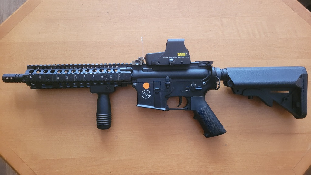 Airsoftová zbraň MK18 MOD1 (T7) celokov TopArms Prodám airsoftovou celokovovou elektrickou zbraň MK18 MOD1 (T7), 1,7J, 125m/s, celokov - černá TopArms. Červen 2024 seřízená, upravena eletrika, přetěsnění, lepší držák zásobníků, Únor 2025 1700kč airhard profesionální servis. Součástí nabídky jsou: 4x tlačné zásobníky + sumky+ ochrana kolimátoru + úplně nová baterie Titan CQB 9,6V/ 1700mAh + jednobodový popruh+ nabíječka NiMH baterií. Původní cena zbraně: 5 930 Kč Cena za komplet 5800, při rychlem jednani sleva. Osobní předání možné v Chotěboř, Havlíčkův Brod, Jihlava, Třešť, Humpolec, Třebíč.