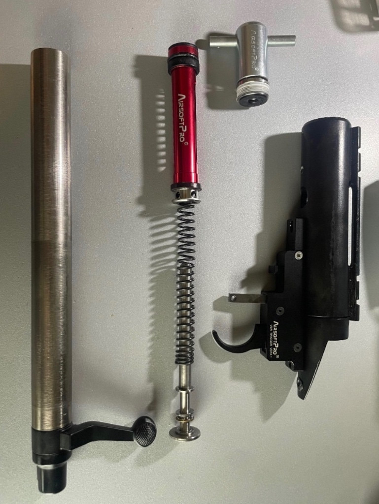 Prodám málo hraný upgrade set od AirsoftPro pro odstřelovací pušky VSR-10. Nepamatuji si přesné názvy, vše viz foto. Na prodej je niklový válec, trn, pružina (M170), píst, hlava válce (také nějaká lepší než originál) a spoušťový mechanismus (myslím AirsoftPro V2 nebo něco podobného).