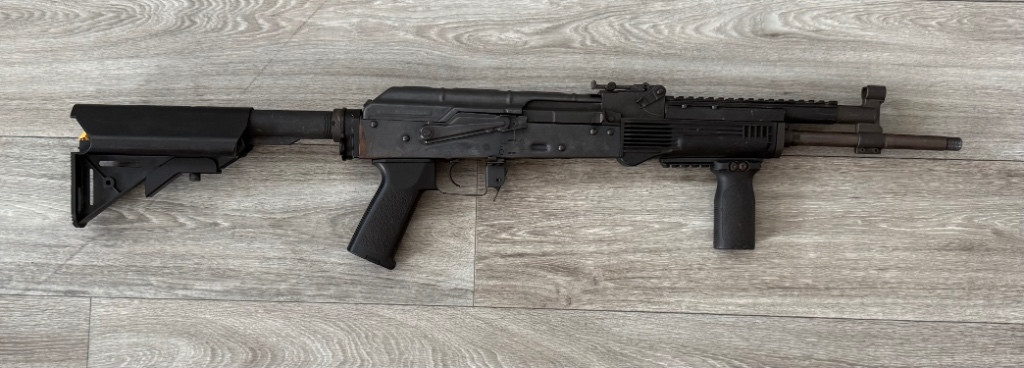 Prodám airsoftovou zbraň AK-104 Tactical (AK702) Gen.2 od E&L – špičková replika s vylepšeným vnitřkem a příslušenstvím. Popis zbraně: • Uvnitř nová pružina M130 od Guarder • Na předpažbí přidělaná RIS lišta a přední grip • Jedná se o nejlepší verzi E&L Gen.2 s ocelovým tělem a kvalitním zpracováním • Mechabox bez úprav zvládne i pružinu M170 • Zesílený mechabox s 9mm ložisky, systém rychlé výměny pružiny (QSR) • Vnitřní hlaveň 6,04 mm pro vyšší přesnost • Tělo z oceli, kvalitní polymerové části • Taktická teleskopická pažba z (M4), možnost rychlé demontáže jako u ostré zbraně • Součástí prodeje jsou 3 zásobníky a tlumič • Hmotnost cca 3,6 kg, délka 78,5–96 cm Stav: Perfektní, používaná, vše funkční Při rychlém jednání se můžeme domluvit na slevě