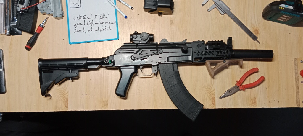 Prodám AEG AK-47 Beta Ris ve funkčním stavu. Zbraň má běžné oděrky od používání, technicky plně v pořádku. Vnitřní upgrady: QD mechabox V3 s pružinou M110 CNC HopUp komora pro AK HopUp gumička MR Hop 60° Vnější úpravy: Hliníkové předpažbí B-11 (5KU) Kovový kryt závěru s RIS Ergonomický přepínač režimu střelby Zvětšený návlek natahovací páky Tubusový kolimátor Tlumič Součástí prodeje: Zbraň viz foto 2× zásobník (točný) Baterie 1600 mAh Ni-MH Kolimátor ℹ️ Stav: Používaná, běžné kosmetické oděrky Bez prasklin, bez vůlí Plně funkční Cena: 7 000 Kč při rychlém jednání rozumná dohoda možná