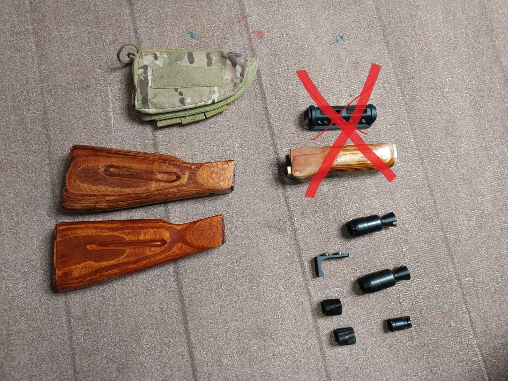 Sunka na pažbu 100,- Dřevěné pažby E&L 200,- kus . Kompenzátory E&L 200,- kus.