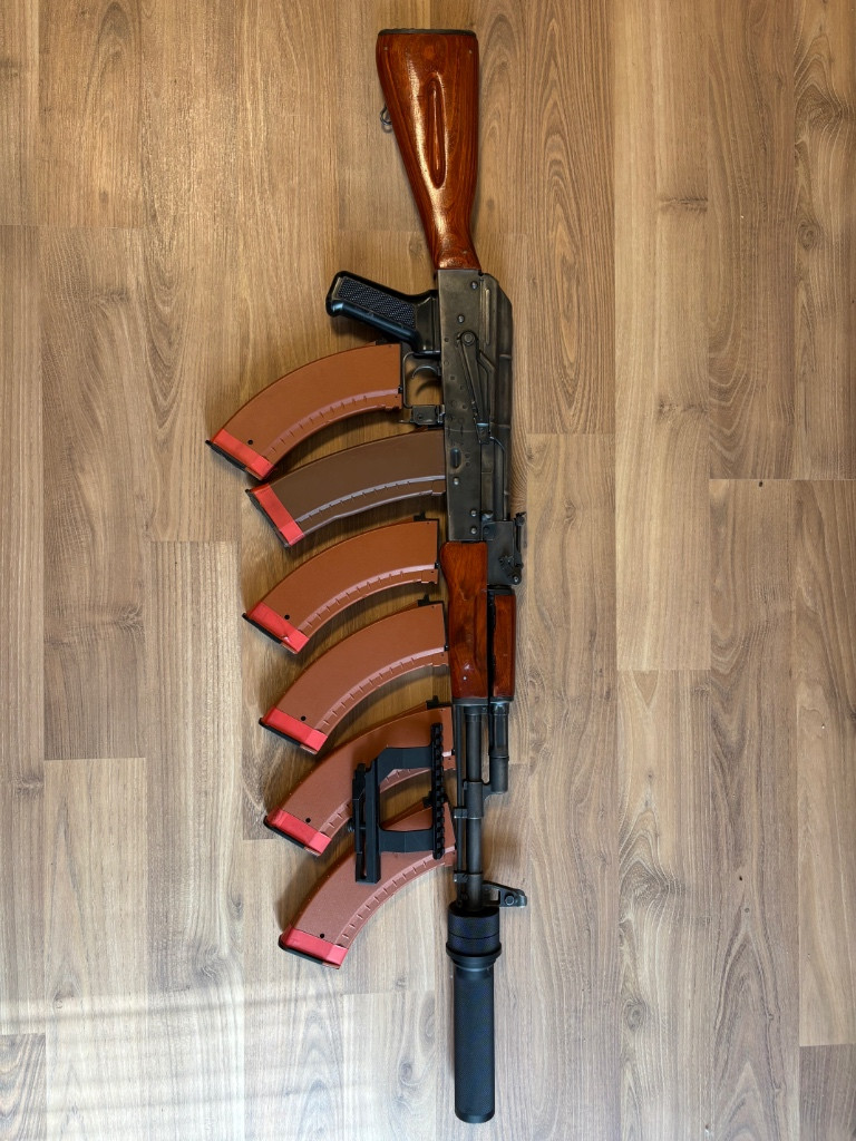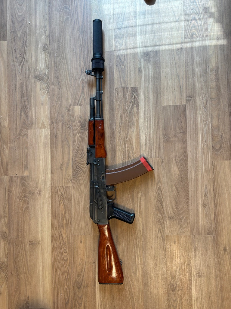 Prodám vylepšené ak47 od E&L, zbran mam asi rok, je tam lepší motor, kompletně vzduchotechnika, hlaveň, hop up gumička, kola, pružina,… mam k tomu dost zásobníku. Dalsi 2 železné nejsou na fotce. Montáž na optiku. Zbran ma 1.9J.
