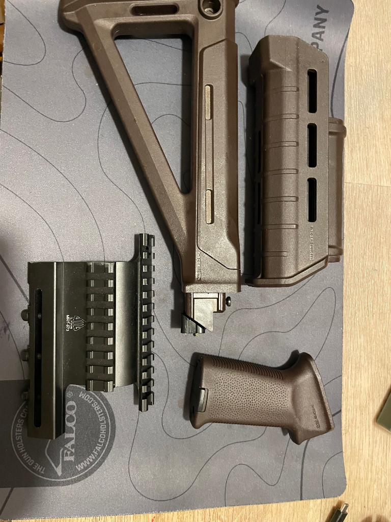 Prodám kompletní pažbení na AKM Magpul MOE v barvě PLUM a boční montáž UTG