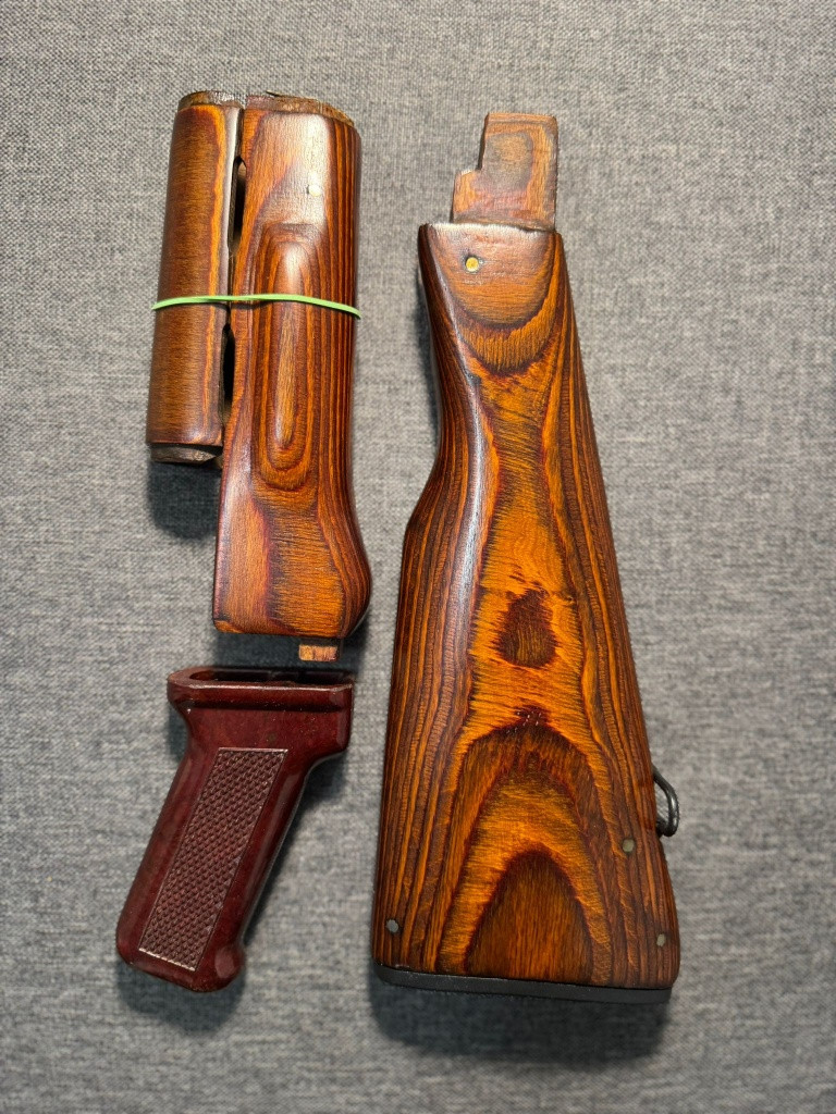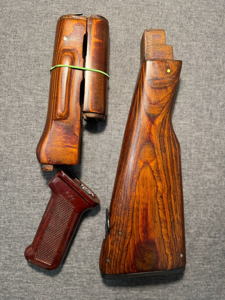 Prodám sadu originálního dřevěného pažbení na pušku AKM - 7,62x39. Velmi dobrý stav. Cena bez ručky je 2500 kč, s ručkou 3000 kč. Poslat zásilkovnou není problém. Na dobírku pouze při platbě předem poštovného. Kontakt prosím emailem.