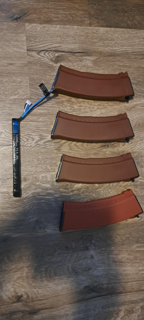 Prodám krásné AKS-74U Tělo je celokov s dřevěným předpažbím. Vnitřnosti: Perun procka, Guardian set (kola, vzduchárna,M120 pružina), CNC spoušť, Maple leaf gumka, lehce protažená hlaveň do kompenzátoru. Na těle byl vyměněn selector (vnitřní mechanizmus se vysypal a byl vyměněn za kompletně nový s CNC selectorem Ke zbrani přidávám 4 tlačáky od E&L a Titan 11.1V lipolku (ta je uplně nová jen rozbalená) Na 0.28 dává 1.5J Posílám přes zásilkovnu O ceně jsem ochotný jednat