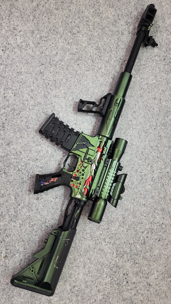Prodám tento velice unikátní design na velice okoukané platformě AR-15. Je v tom komplet upgrade, CNC komora s nasvětlovákem, CNC mechabox s QSC, EPES vzduch( 21,8mm tryska,hlava válce, hlava pístu), nerez válec, RA píst, SHS 100:200 kola, recoil kit, Poseidon hlaveň se vzduchovou drážkou a s gumičkou. Závěr lze natáhnout, zajistit a uvolnit tal jako u ostré zbraně. Při výstřelu se rozsvítí v komoře UVledka, můžete používat nasvětlovací kulivo. Nesvítí tedy furt, což by vás mohlo při nočních akcí prozradit. Taky vás při střelbě oproti klasickému AEG citelně kopne, Tyto dva systémy lze snadno odpojit. Kvůli recoil kitu musí vést kabel pod trubkou do pažby ve které je pak místa dost i pro dvě 11,1v lipol baterie typu "nunchaky". Zbraň má výkon 2.11J s 0,28g kulemi na M120 pružině, tzn. vše je složeno velmi dobře a zbraň dává dost nad pružinu. (2J = 140m/s s 0,20g). Celé je to nastříkané barvou "modrozelený chamaleon" a bezbarvým lakem. Mechabox má rychlovýměnu pružiny, lze tedy výkon nastavit dle vašich preferencí. Do odpovědi na inzerát prosím uveďte vaši nabídku ceny, děkuji