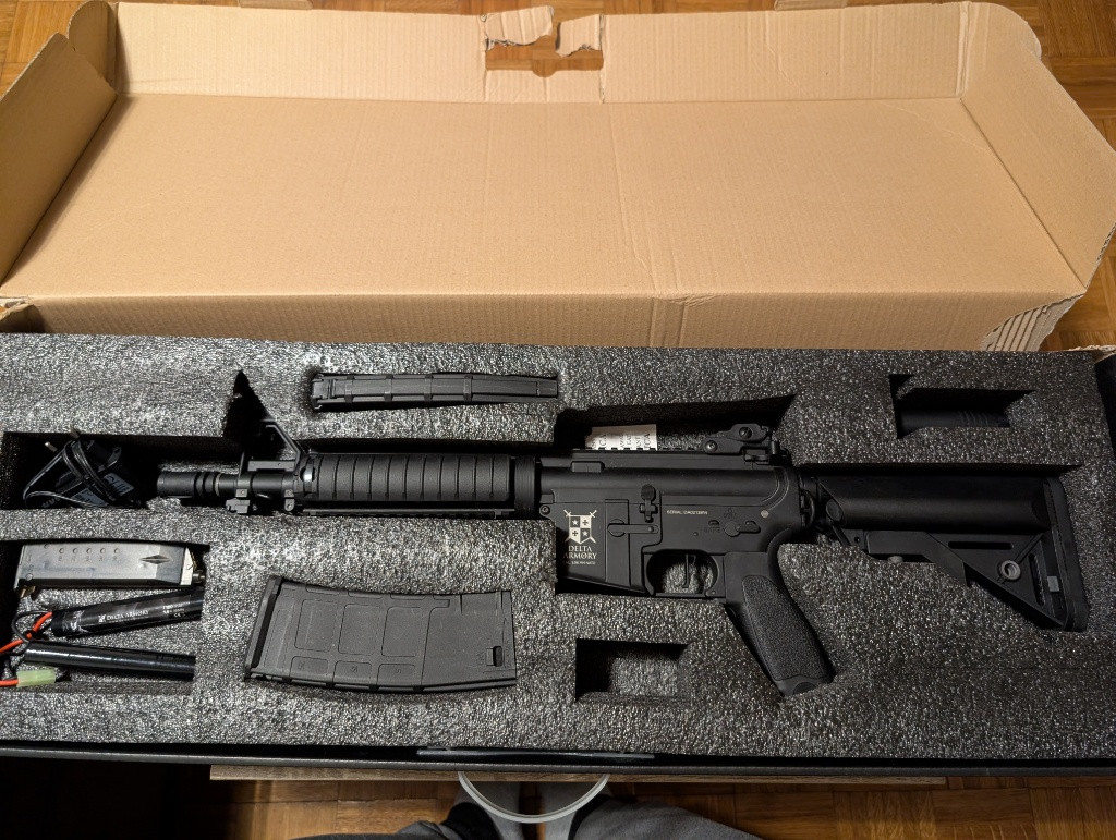 Prodám minimálně střílenou airsoftku AR15 CQB-R ALPHA Full Metal od značky Delta Armory. Zbraň je ve stavu nového kusu, bylo z ní vystříleno pouze cca 500 kuliček na zahradě. Nikdy nebyla na žádné akci, je bez škrábanců a plně funkční. Hlavní přednosti modelu ALPHA: Celokovové tělo: Robustní konstrukce (Full Metal), žádné plastové tělo. Vnitřní díly: Rotary hop-up komora, systém rychlé výměny pružiny QRS Gen.2. Vychytávky: Rychlá výměna motoru bez nářadí, ergonomická motorová pažbička a A-style spoušť. Obsah prodeje (vše, co je na fotkách v krabici): Airsoftka: AR15 CQB-R ALPHA Full Metal. Zásobníky: 4x tlačný zásobník (Mid-Cap) – 2x DMAG s texturou, 2x standardní M4. Pohon: Akumulátor Delta Armory 9,6V 1100 mAh a nabíječka. Doplňky: Taktická rukojeť, rychloplnička na 100 BB. Munice: Téměř celé 1kg balení kuliček Delta Armory 0,23g. Dva popruhy (jednobodový, dvoubodový) Nejlépe osobní odběr Strakonice