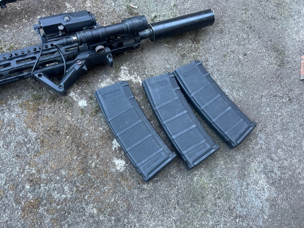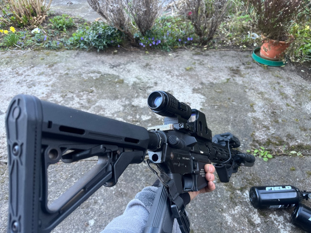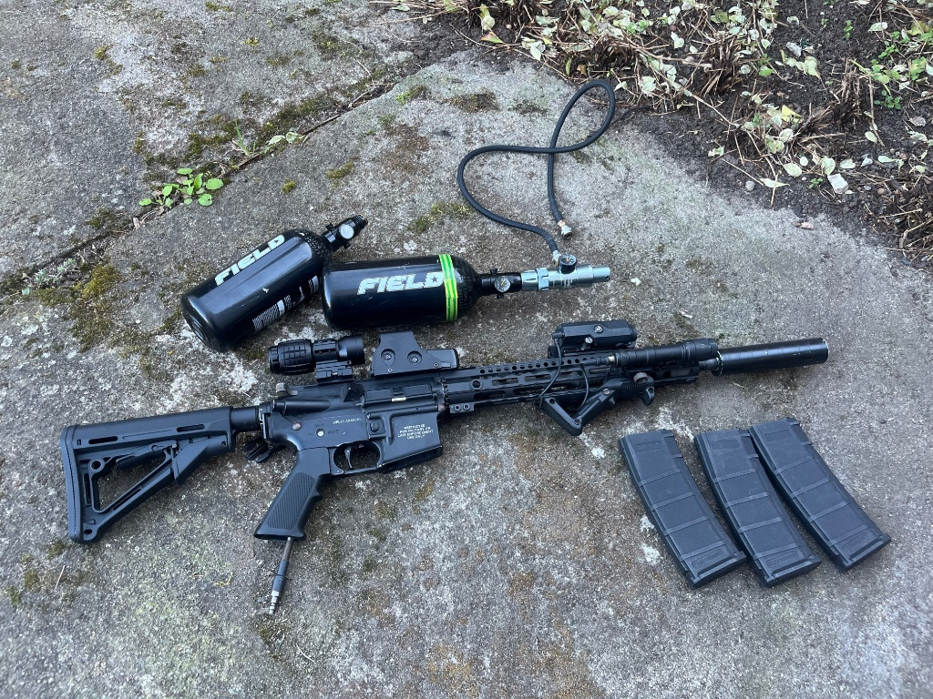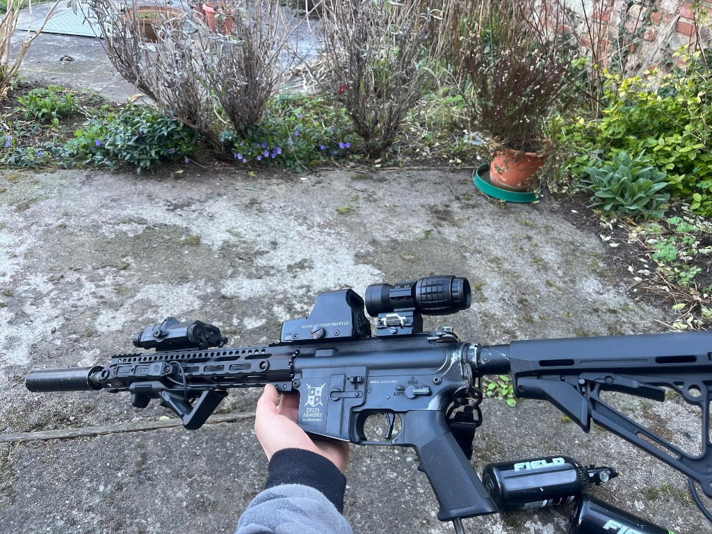 Prodám AR15 s HPA systémem Polarstar F2 stavěno v Racek Customs Guns 6/23. Tělo Delta Armory, duralové predpažbí, přesná hlaveň od Action Army 6,01, CNC spoušť Maxx Model, ProWin komora. Ke zbrani přidám dvě lahve od značky Field o objemu 0,8L, regulátor Valken, hadici Balystik, 3 zásobníky Delta Armory na 120 kulí, toumič od Shiftyho a přepravní kufr od Wosportu. Zbraň prodávám tak jak je na foto. Osobní předání. Pište sms ozvu se zpět. Při rychlém jednání sleva možná.