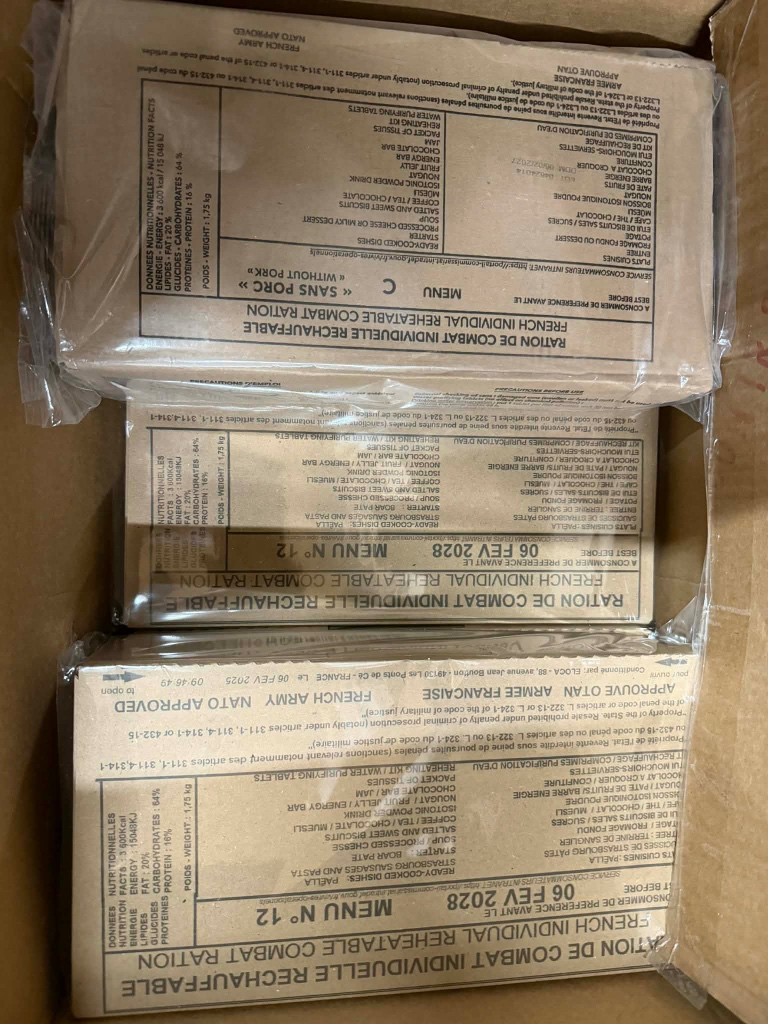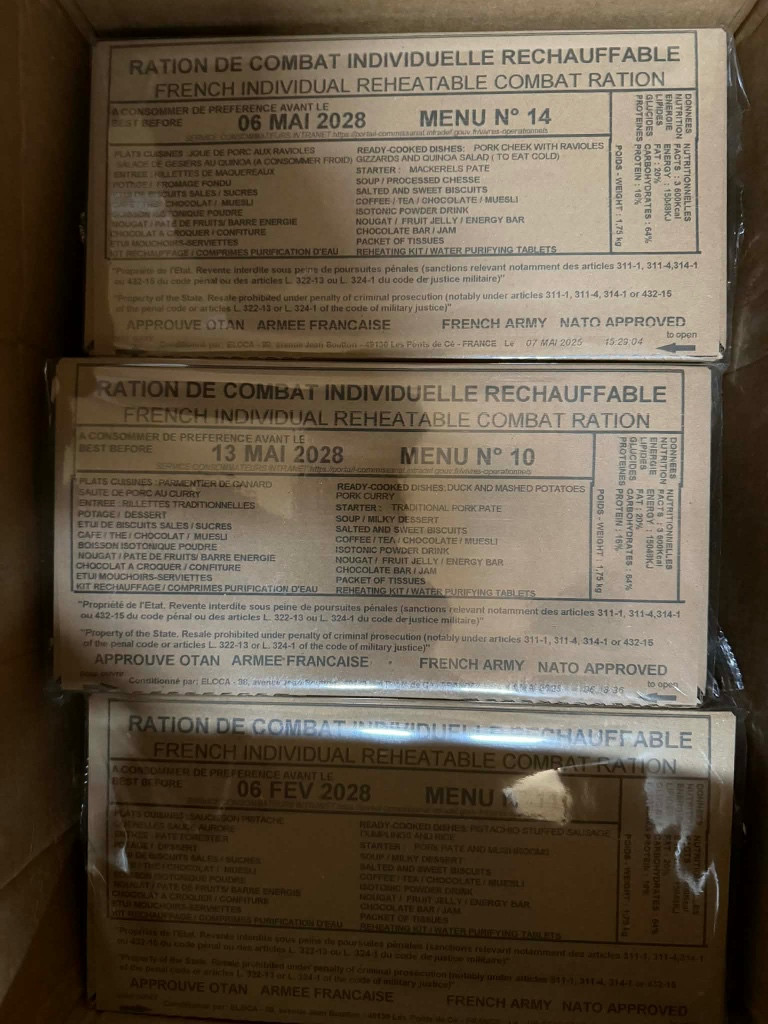 Nabízím: U.S Army MRE kompletní menu na 12 hod ( více druhů menu 190kč/kus ) Francouzské MRE kompletní menu na 24 hodin (konkrétní menu na dotaz skladu 480kč/ kus ) V případě jakýchkoliv dotazů mě neváhejte kontaktovat