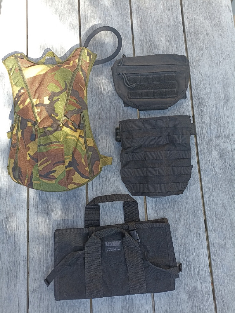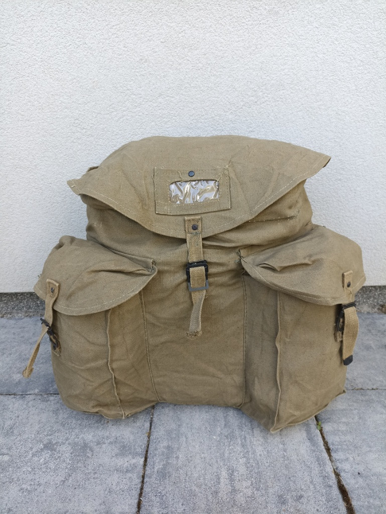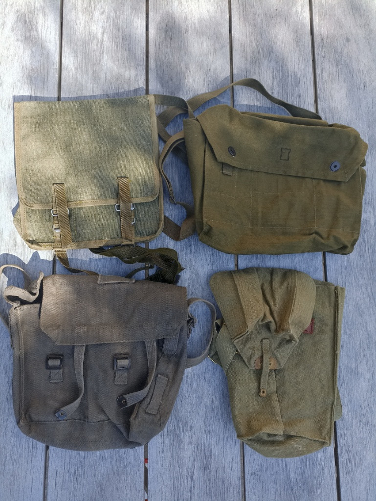 Plátěné batohy, Italská armáda cca 1950. Velký 500,- malý 300,- Sumka Warrior 500,- rolovací lékárnička Blackhawk 600,- stehenní panel molle Blackhawk 500,- Camelbak DPM 600,- Tašky na plynové masky: úzká Belgie 300,- Finská 300,- Malá polní, silné plátno, asi Belgie nebo Itálie 300,- Ceny jsou k jednání, napište, domluvě se nebráním.