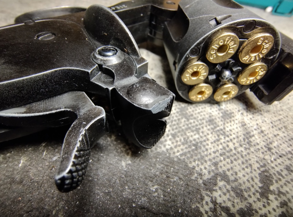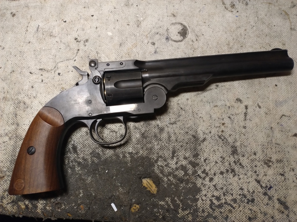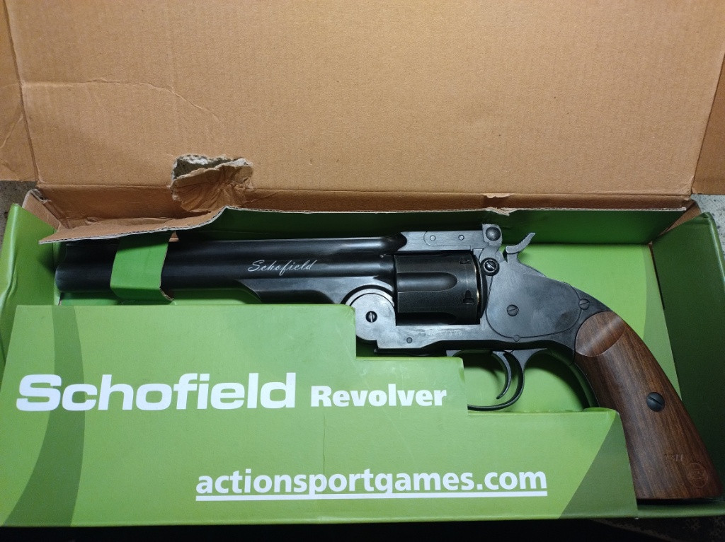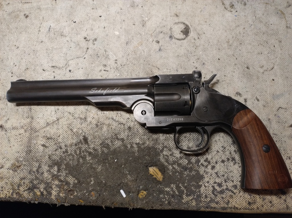 Prodám revolver Schofield v černém provedení. Plně funkční, těsní, všech 6 patron je součástí prodeje. Jediná vada je poškozená hrana zadního mířidla.
