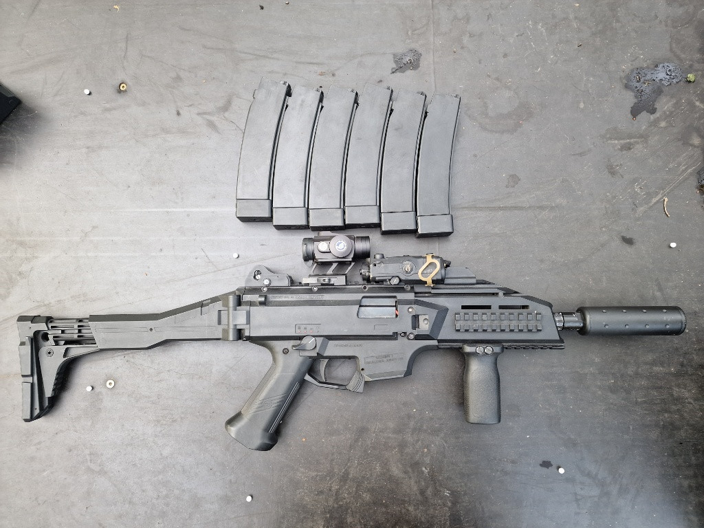 Zbraň je pár let hraná a to znená, že má pár šrámů a chybí jeden šeoubek viz. foto, nicméně není nějak extra důležitý (ten samí je z druhé starny a ten stačí). Taky je už trochu ochozený přepínač střelby (tužší safe pozice), imitace závěru trochu drhne a nefunguje elektronické bolt catch. Zbraň je krom výše uvedeného naprosto funkční s víkonem viz. foto. Vevnitř je Madbull hlaveň, ASG boost 30000 motor a v mechaboxu je kombinace základních a SHS dílů. Ke zbrani přidám 6 funkčních zásobníků a jeden na náhradní díly, originální mířidla, tlumič a grip. Prodávám bez kolimátoru a pequ. Předání buď osobně a nebo poštou.