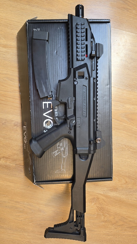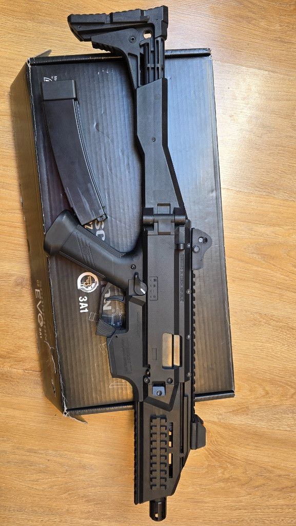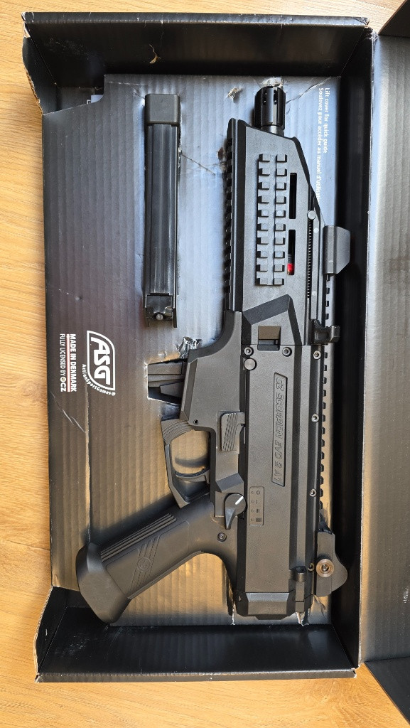 Prodám airsoftku ASG scorpion Evo, hraná tak 3 roky, v základu, jen jina hlava pístu. Navíc je zde prostřední díl pažby z reálného Scorpiona a má duralové tlačítko ke sklopení pažby. Zbraň nese známky použití, rýhy a tak, ale jinak je nepoškozená a plně funkční. Při posledním měření 1.3J na 0.28 BB. Jeden zasobník, bez baterie.