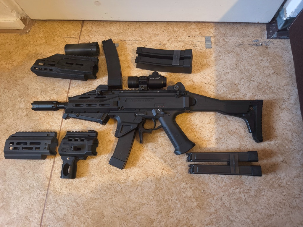 Prodám nejvyšší řadu legendárního škorpiona. 4x tlačný zásobník, několik 3D tisků předpažbí, redukce pro tlumič, kolimátor, makety tlumiče, mám taktéž nasvětlovací tlumič úplně nový, nepoužitý, ale ten by byl za příplatek 1000kč ace tech s možností realistického záblesku pro střelbě. Zajímavostí je že Evo zastaví střelbu v případě že dojdou kuličky, má rychlovymenu pružiny, na M140 dává lehce přes 2J, stabilní výkon, vše těsní a jede jak má. Bohužel nemám na soft čas a mám až moc zbraní.