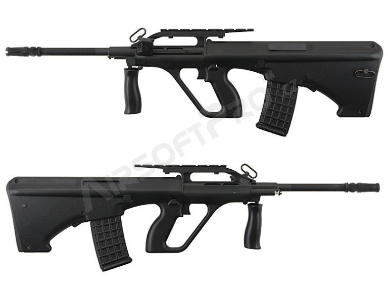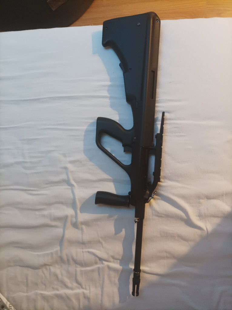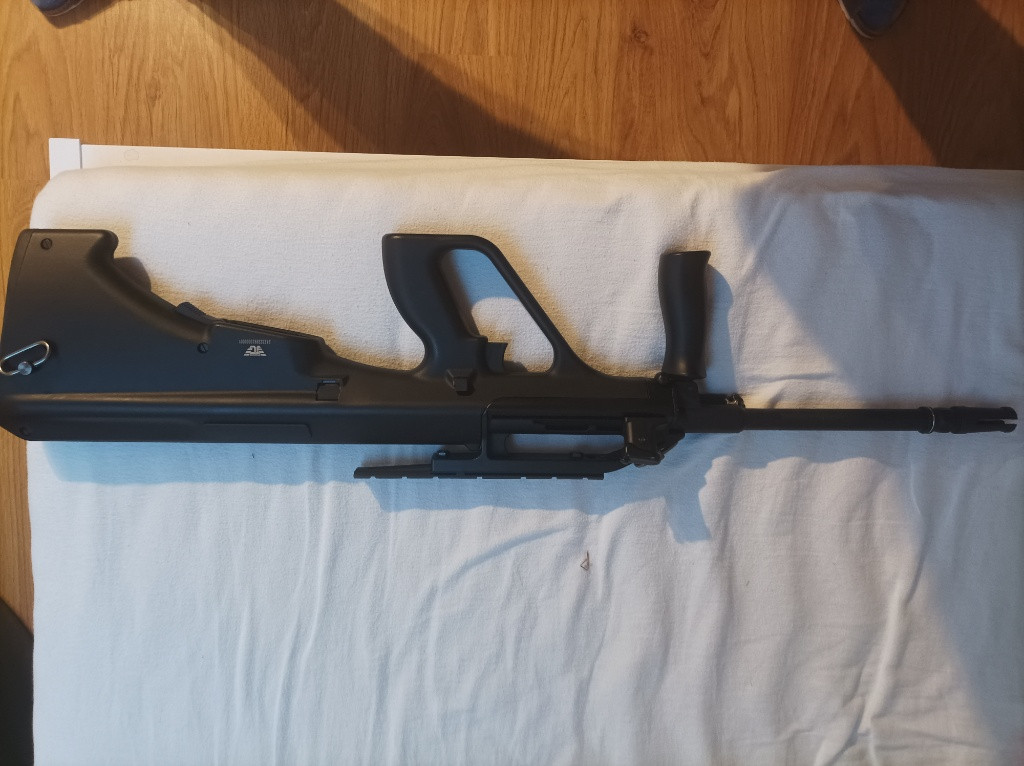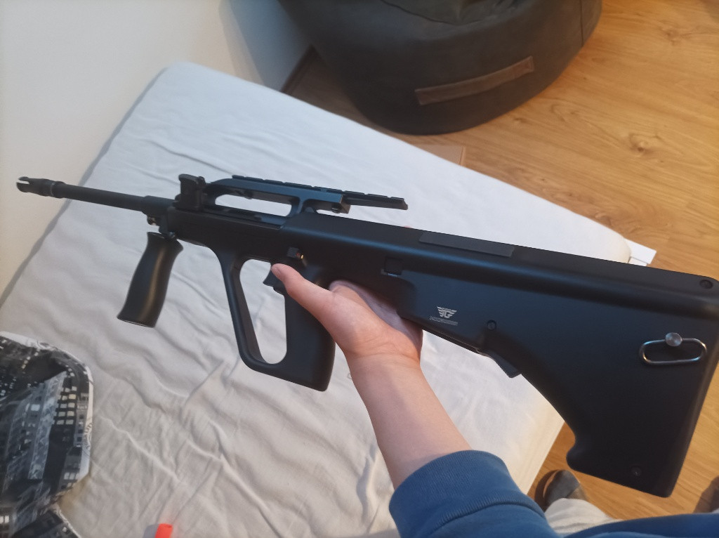 Prodávám Aug airsoftovou zbraň je 3krát použita. K ní 2 točné zásobníky na 330 ran, 1 akumulátor - NiMH 8,4 V / 1600 mAh + jeden základní akumulátor a zásobník.