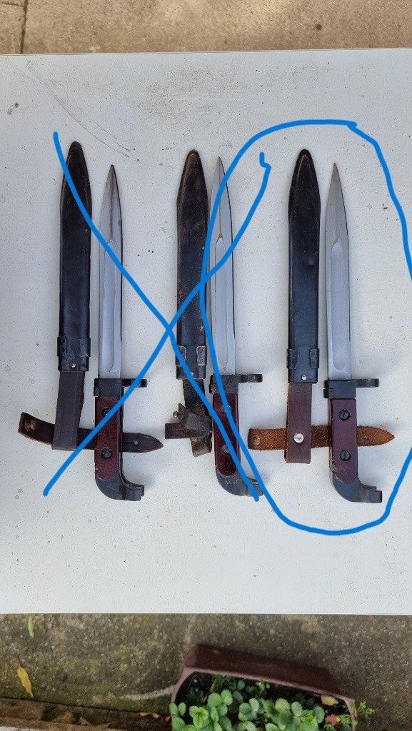 Original bajonet, prvni model AK47. Kompletní, pěkný stav. Osobní předání na Tisnovsku, případně Brno. Cena za kus označený v oválu. Prosím nepsat SMS. Při rychlém a solidním jednání nebo koupě více kusů, je možná dohoda o ceně.