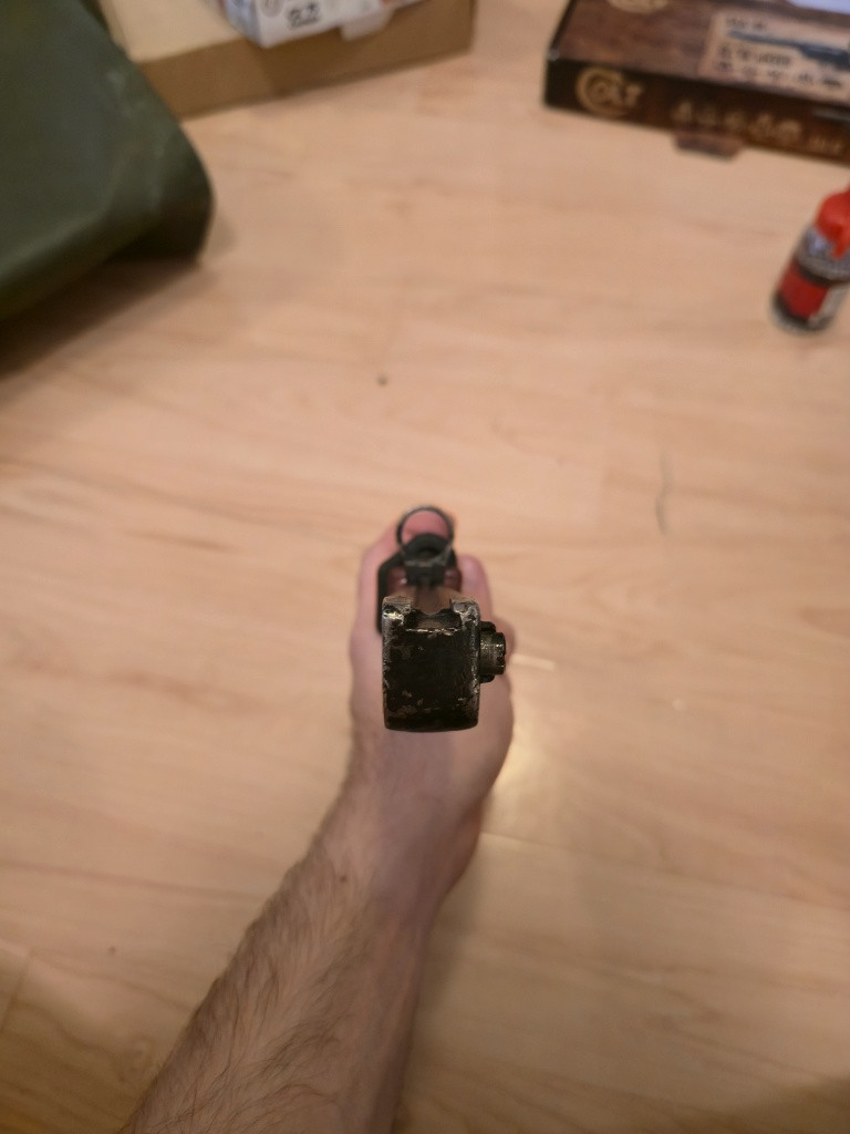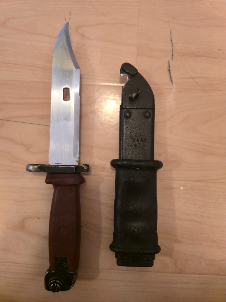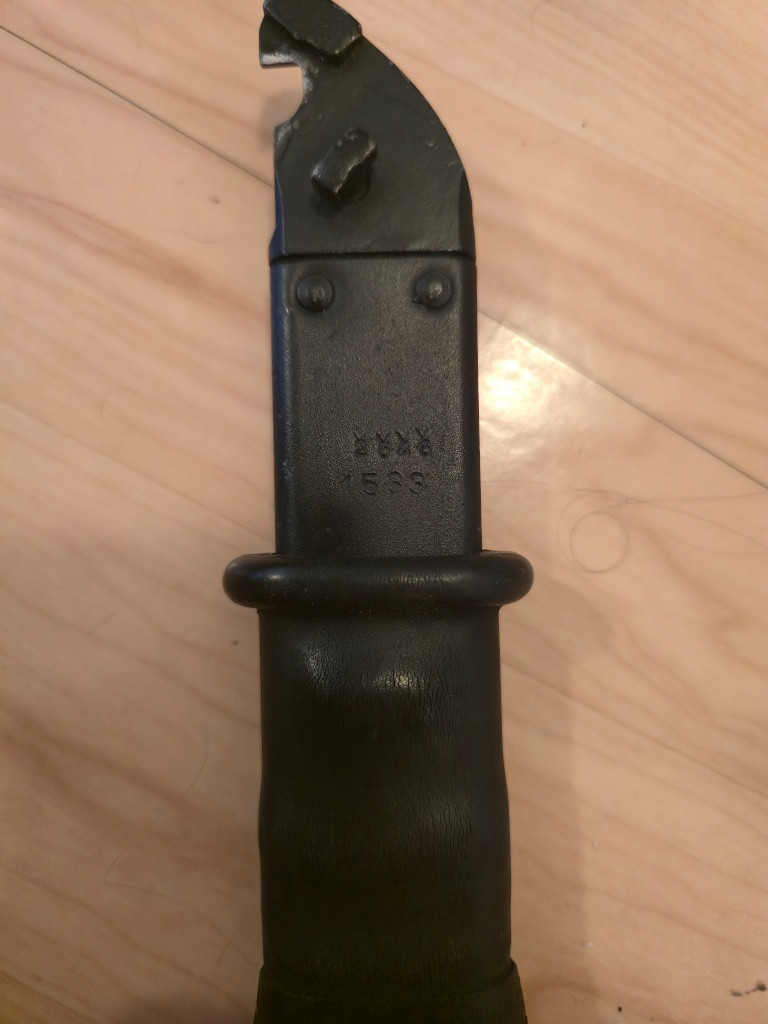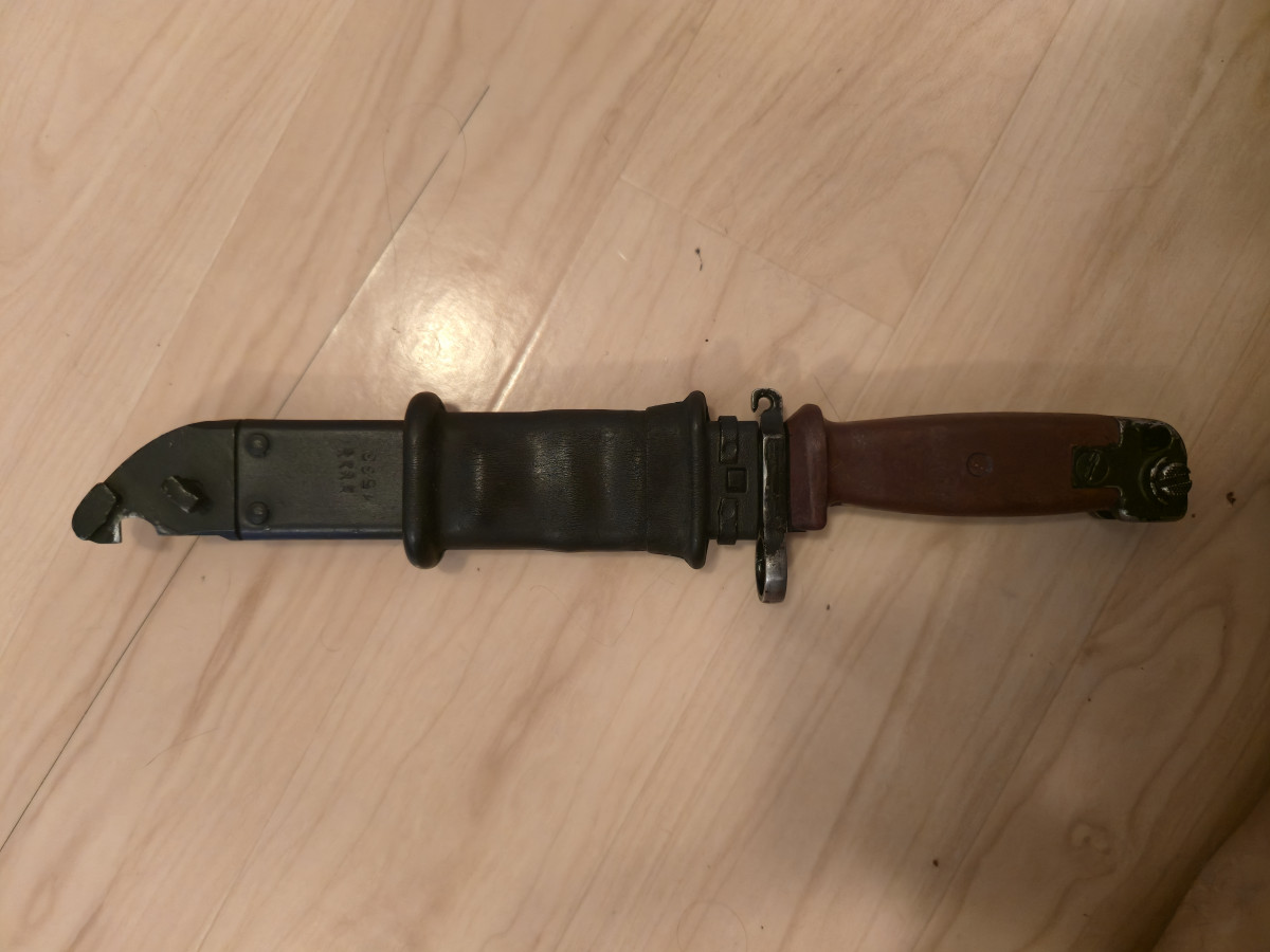 Nabízím originální šavlový/bajonet 6X3 vhodný k puškám AKM/AK-47. Kompletní vojenský kus: čepel v dobrém stavu, rukojeť s vyraženým sériovým číslem 1533, kovové pouzdro (originál). Bez viditelné koroze, funkční zámek. Délka čepelí ~15 cm, celková délka ~28–29 cm. Ideální pro sběratele vojenských předmětů nebo doplněk ke zbrani.