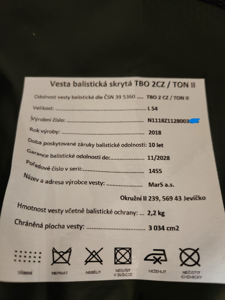 Prodám vestu od výrobce Mars Jevíčko odolností TBO 2 české normy proti krátkým pistolovým řežím (třeba 9mm Luger,americká norma III.A), a ochrana proti propíchnutí TON II. Velikost XL je taková univerzální,možno nastavení doladit sucháčema aby vesta seděla. Expirace 11/2028 . Vestu můžete pohodlně nosit pod bundou,mikinou,kombinézou pro svou vlastní ochranu nebo do služby.Je dobré být připraven než překvapen... Stejné vesty používá SKPV policie ČR. Cena za jednu vestu je 7000kč,možnost zaslání Zásilkovnou na dobírku. Rozprodej přebytků z moji sbírky co nevyužiju.