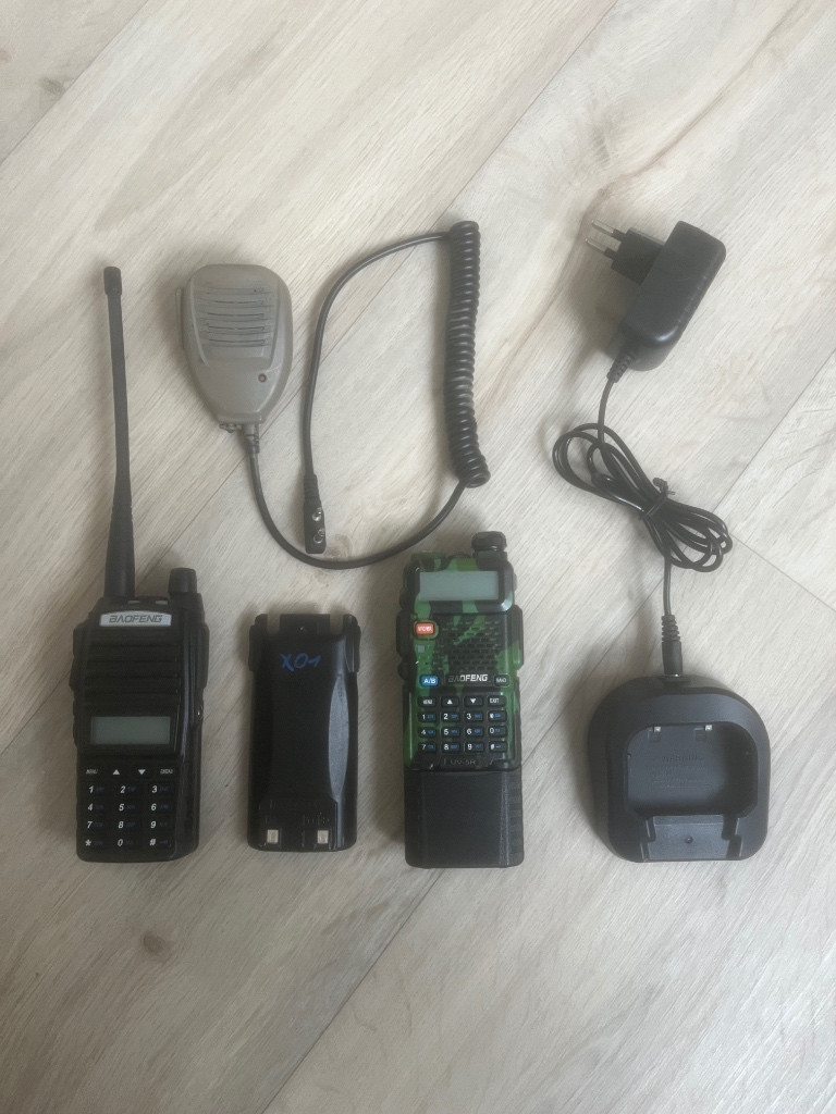 Vysílačky Baofeng UV-82 a UV-5R + všechno příslušenství na fotce, k UV82 dvě baterie a nabíječka. UV5R s větší baterií ale bez nabíječky a antény. Dále bao PTT mikrofon/reproduktor. Vše plně funkční. Rozumné ceny dohodou, podle toho co kdo vezme.